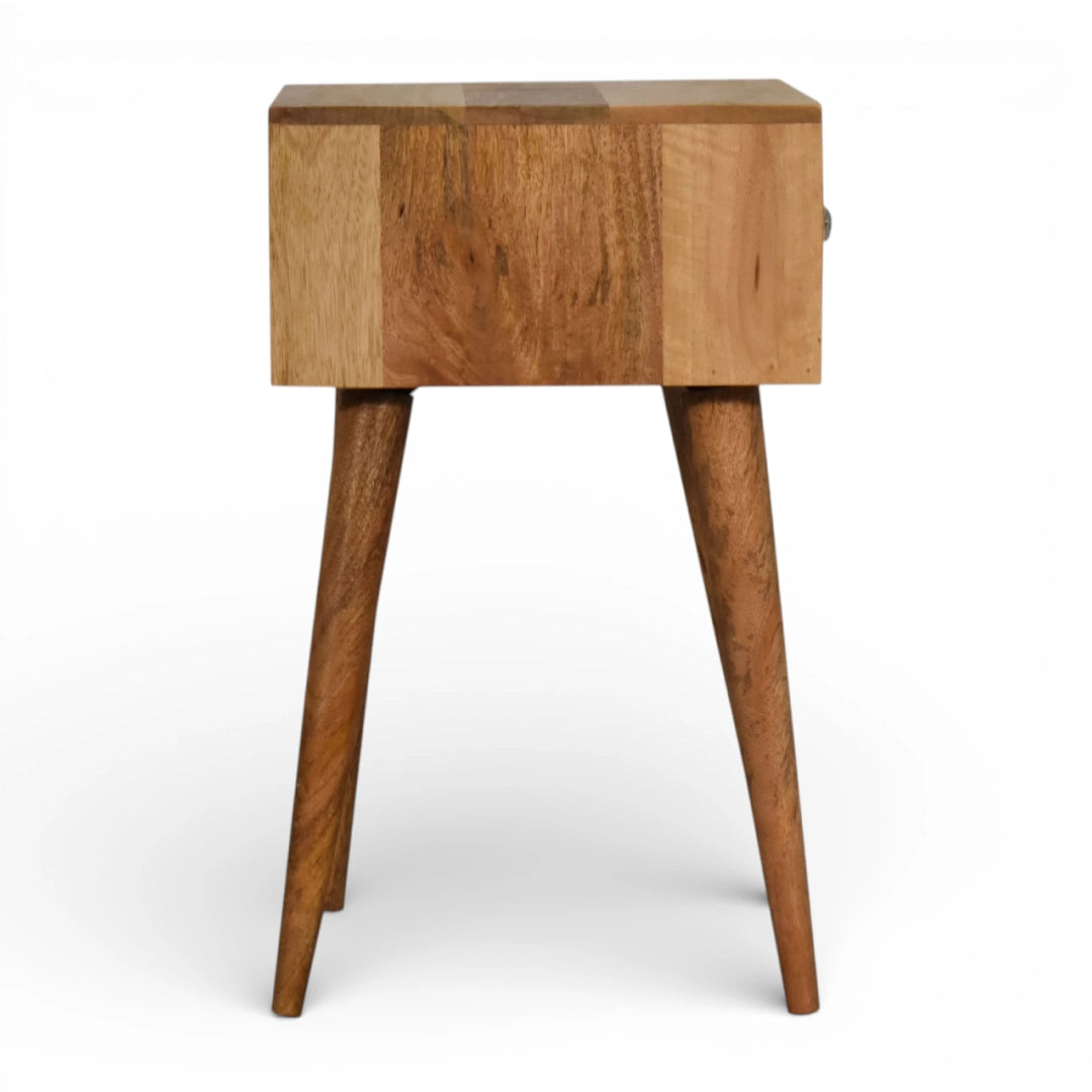 This compact bedside table is handcrafted from 100% solid mango wood in an oak-ish finish and features a single black and white bone inlay drawer for discreet storage. A neat tabletop offers space for a lamp or favourite book, while four tapered Nordic-style legs give it a light, mid-century feel that suits most interiors.