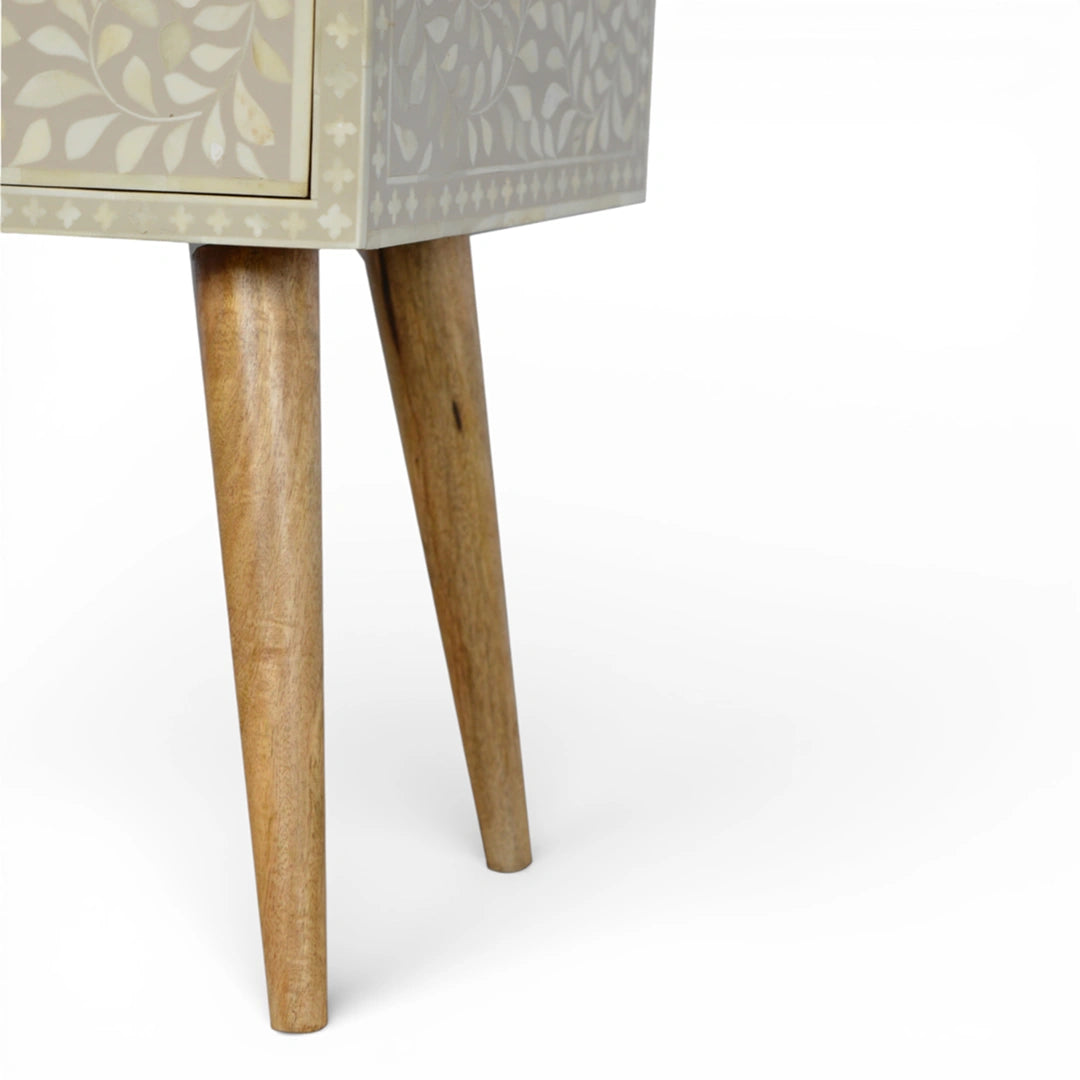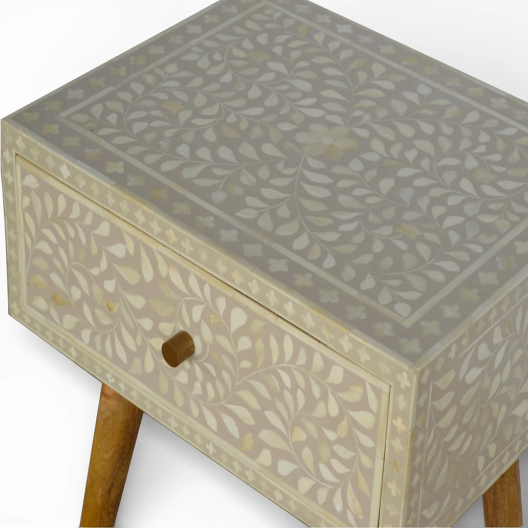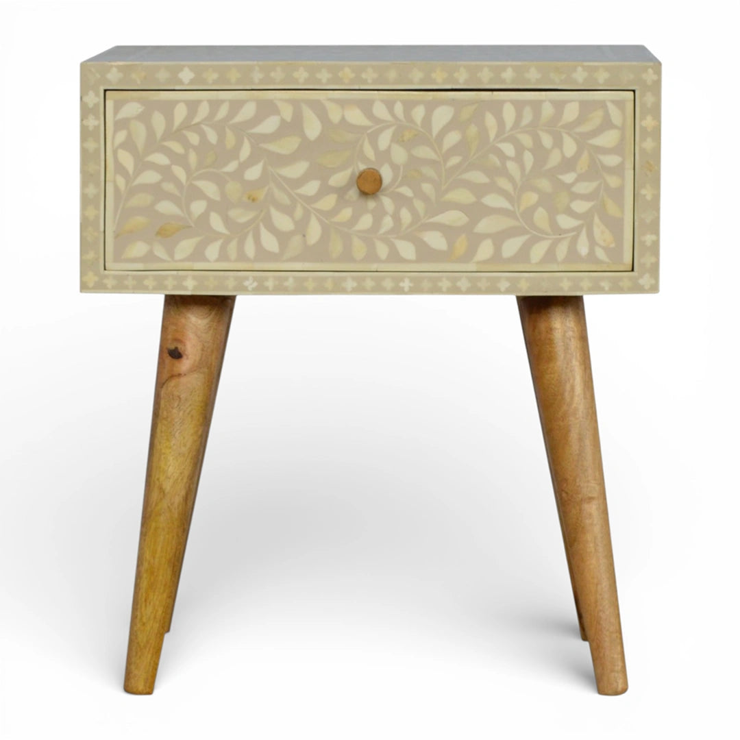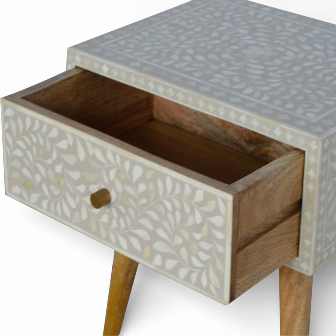 This bedside table is handcrafted from 100% solid mango wood and finished with a softly painted grey top featuring a delicate floral bone inlay design. A single spacious drawer keeps night-time essentials tucked away, while the oak‑ish base and Nordic-style legs bring a light, mid-century feel that pairs easily with a range of bedroom styles.
