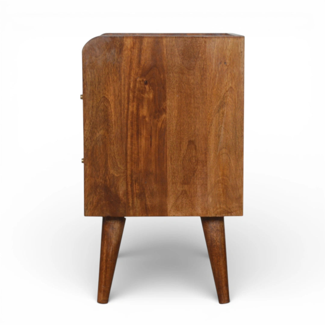 Constructed from 100% solid mango wood in a fine chestnut finish, this gold abstract bedside table brings sculptural detail to your bedroom. Two drawers provide handy storage, while the fronts are overlaid with a sweeping gold brass abstract inlay that stands out beautifully against the warm wood grain. Set on four tapered Nordic-style legs, this wood and gold bedside table adds a refined mid‑century touch to any modern space.