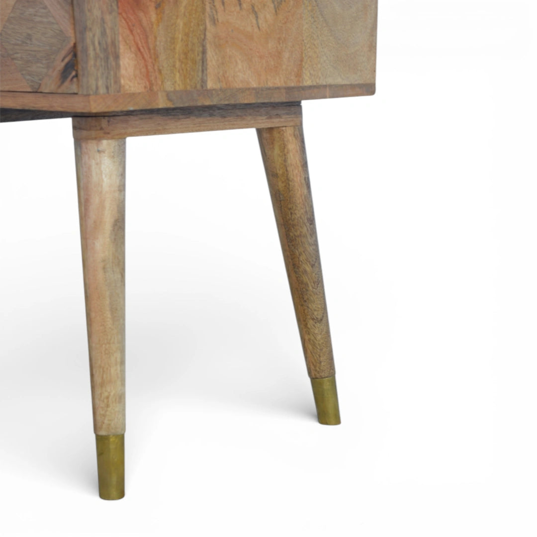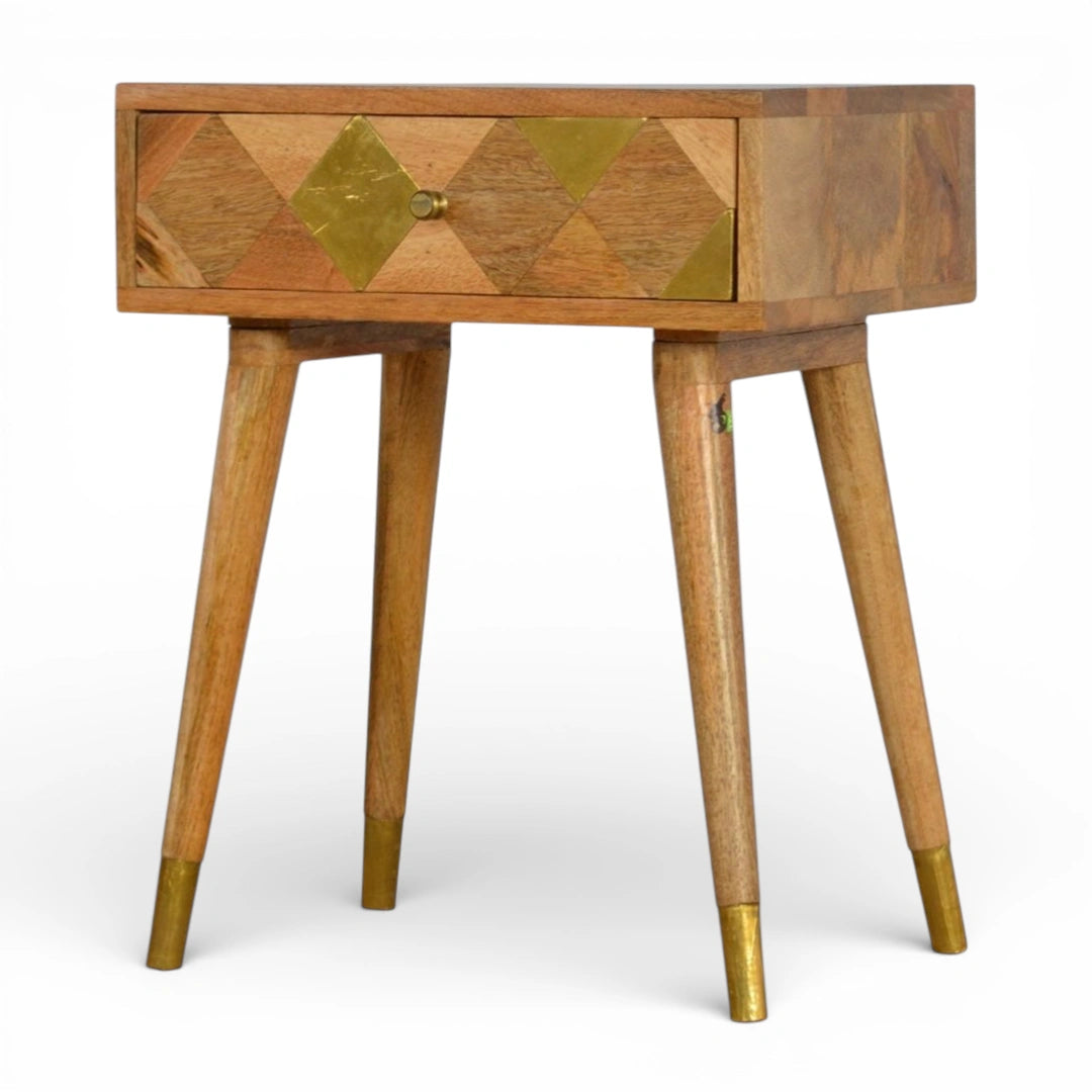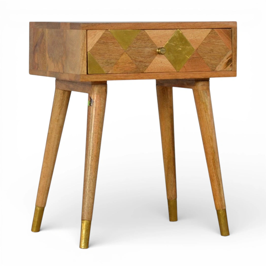 Endlessly versatile, this gold brass bedside table is crafted from 100% solid mango wood in a fine oak-ish finish. The single drawer features a geometric golden brass inlay panel, while four slim Scandinavian-style legs with gold-plated tips add a refined touch. Perfect as a compact gold bedside table or side table for drinks, nibbles or a lamp anywhere in the home.