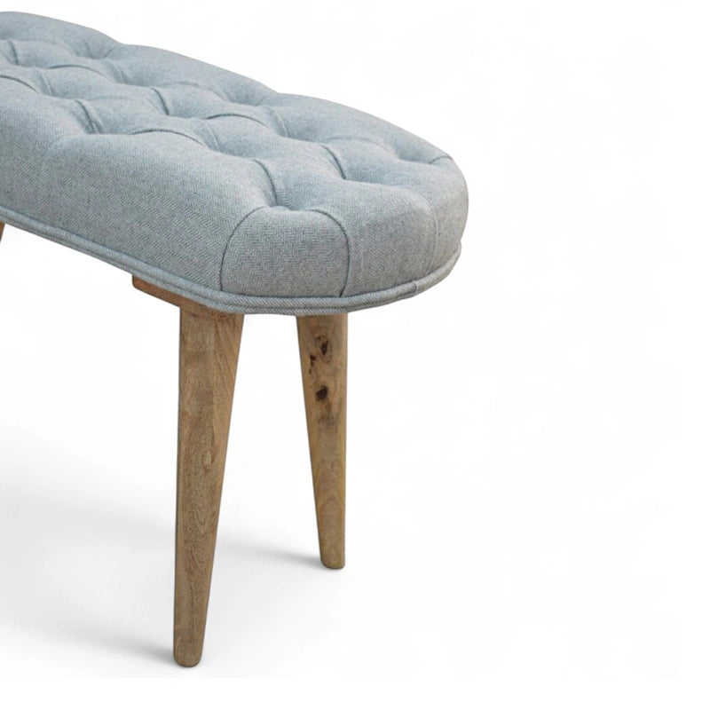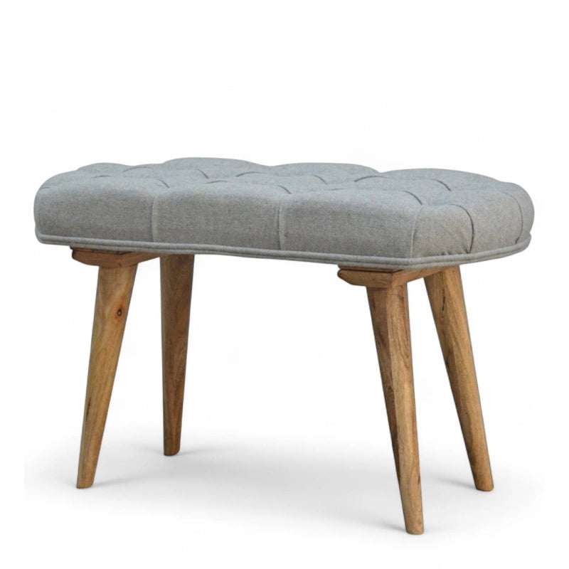 Classic and versatile, this mid-century modern bench is upholstered in deep-buttoned grey tweed fabric for a refined yet cozy look. Its Nordic-inspired design combines a tufted top with tapered solid wood legs, offering both comfort and timeless elegance.