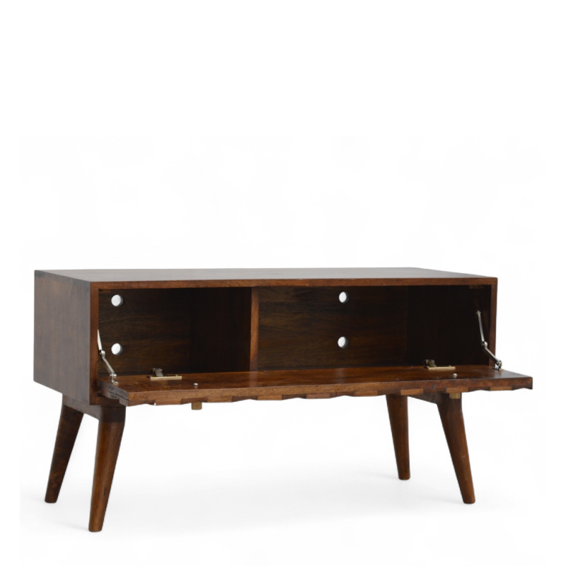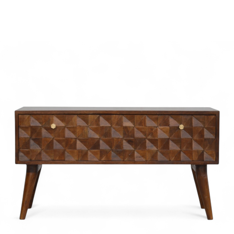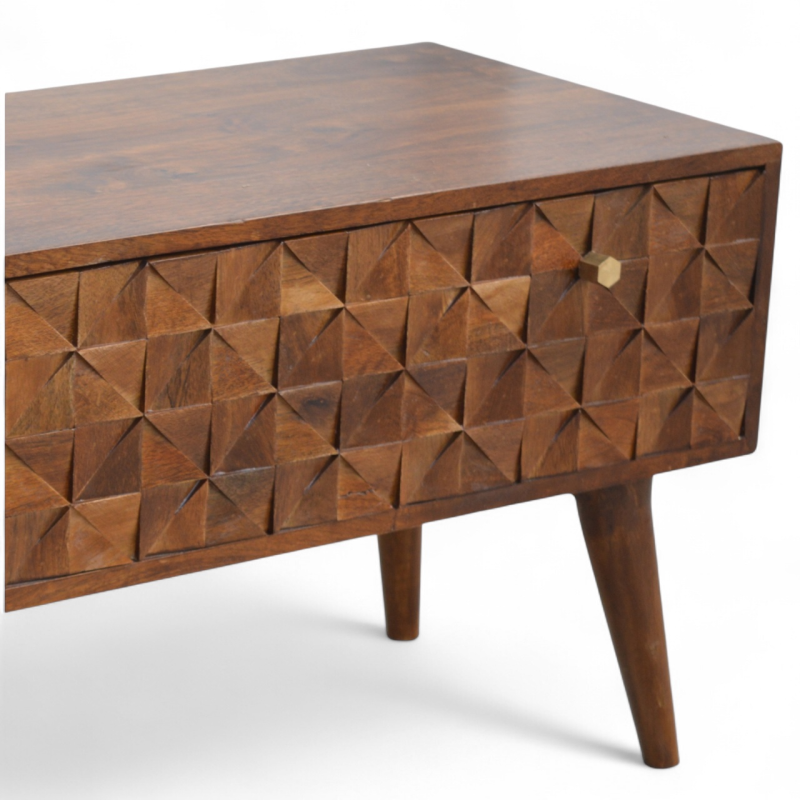 Elevate your entryway with this diamond-carved solid wood storage bench, a masterpiece of craftsmanship and design. Handcrafted from durable mango wood and finished in a rich chestnut tone, this piece blends functionality with artistic detail. The hand-carved diamond pattern across the front panel adds depth and texture, making it a true statement in any hallway or bedroom.