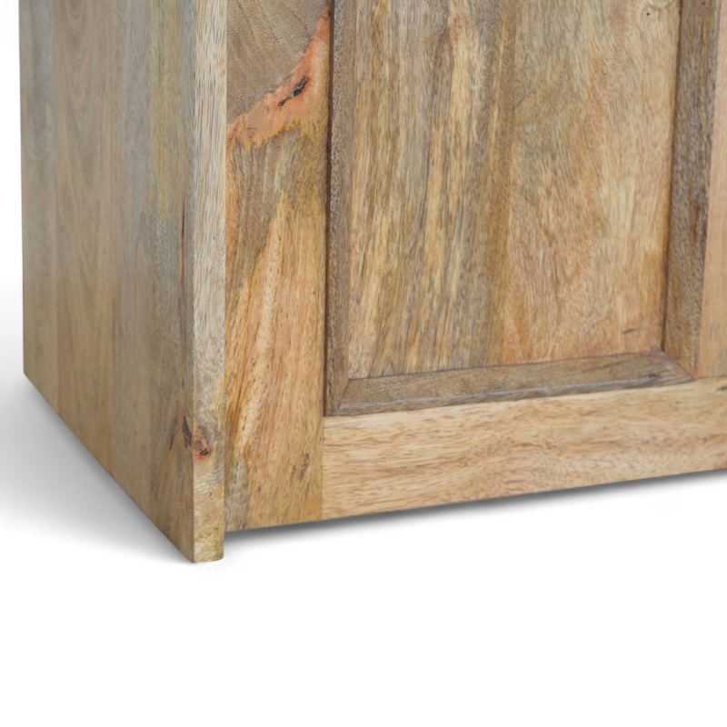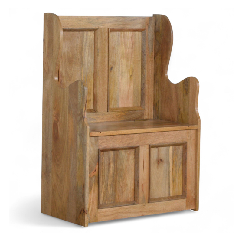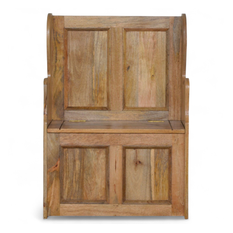 Compact yet practical, this small monks storage bench offers versatile storage with timeless mid-century modern appeal. Handcrafted from solid mango wood, it features a smooth chestnut finish that highlights the natural wood grain. The hinged lid lifts easily to reveal hidden storage, making it ideal for shoes, blankets, or everyday essentials.