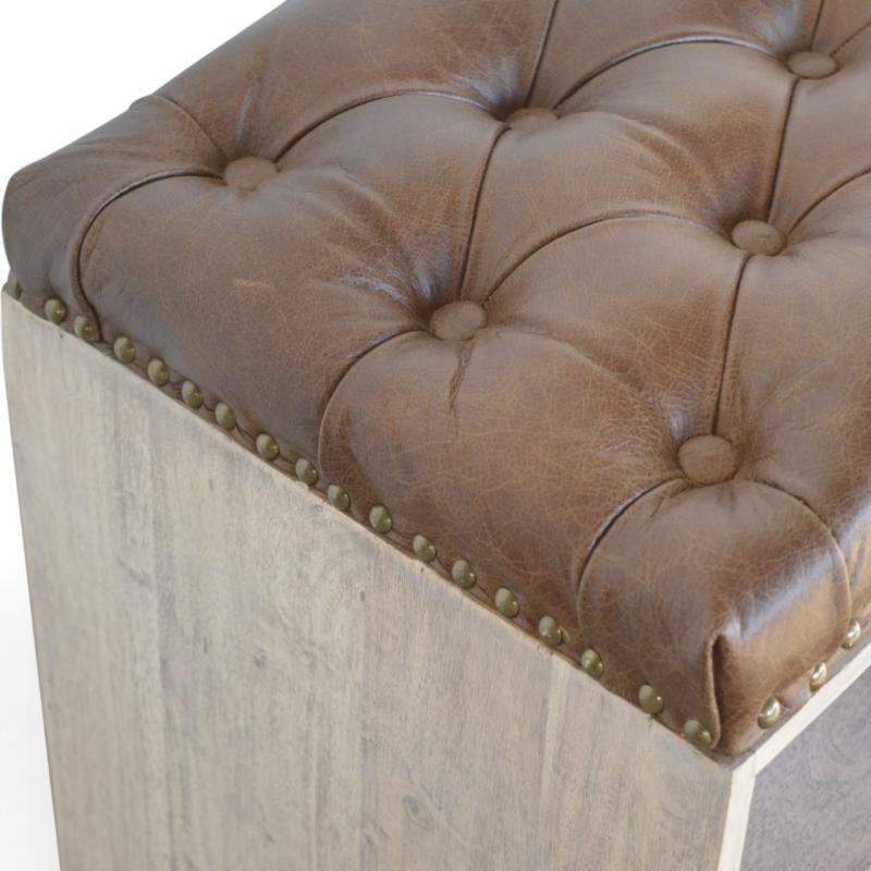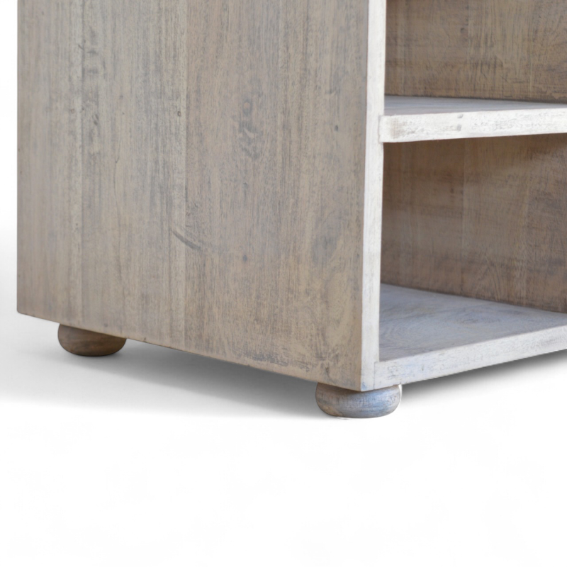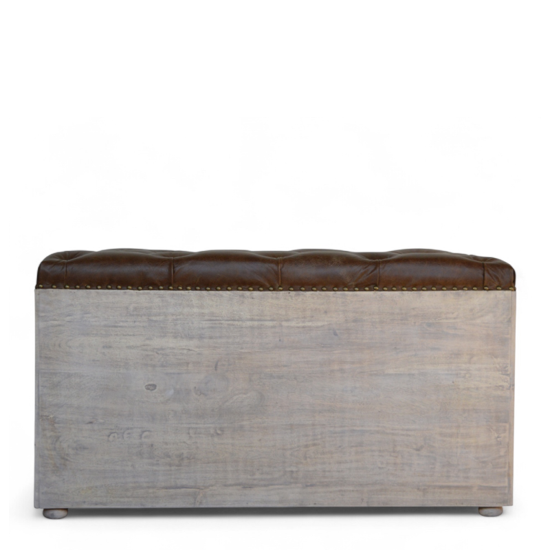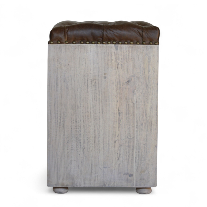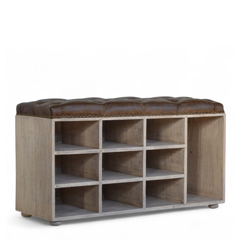 Bold and unique, this buffalo hide shoe cabinet redefines functional storage with striking natural textures. Handcrafted from solid mango wood, it features front panels finished in genuine buffalo hide with an acid wash effect, creating a one-of-a-kind design. The mid-century modern silhouette, supported by tapered wooden legs, balances raw natural beauty with timeless craftsmanship.