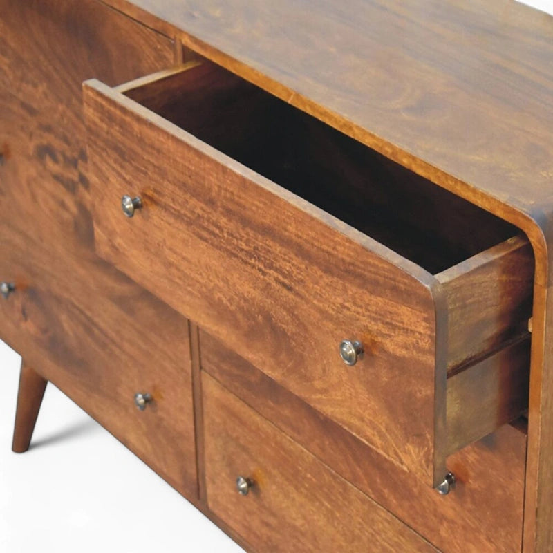 Sophisticated and spacious, this mid-century modern dresser is crafted from solid chestnut wood with a beautifully curved front. Its natural grain and warm finish highlight timeless craftsmanship while offering a sleek, modern silhouette.