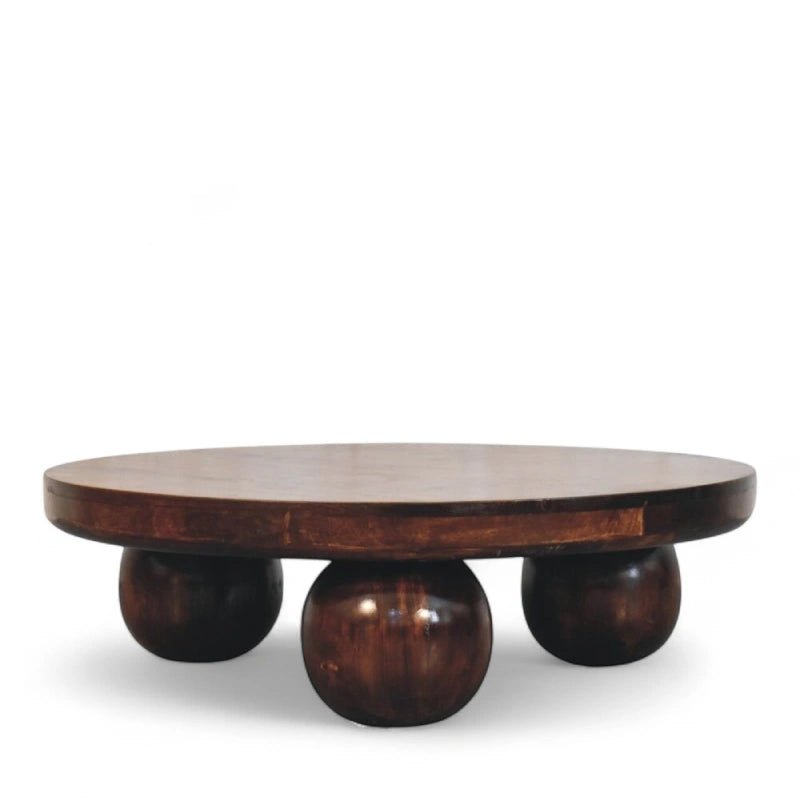 Bold and distinctive, this mid-century modern coffee table is crafted from solid walnut wood with unique rounded ball feet. Its sleek finish and central table design bring both function and sculptural appeal to your living space.
