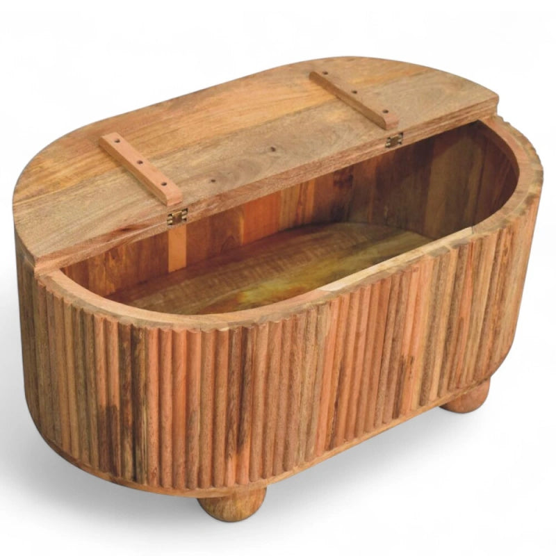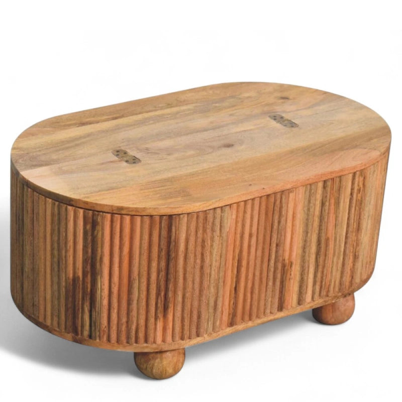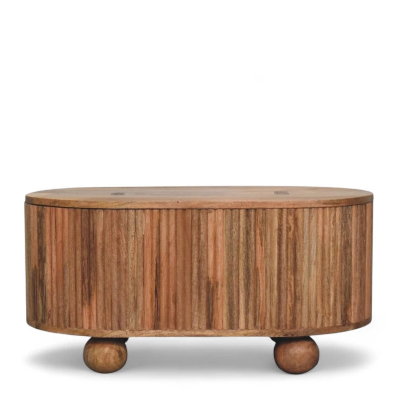 A striking centerpiece, this round Soba Ball coffee table combines bold design with hidden functionality. Handcrafted from solid mango wood, it features a distinctive spherical shape with a removable lid, offering discreet storage inside. The natural finish highlights the rich texture of mango wood while maintaining a contemporary, sculptural look.