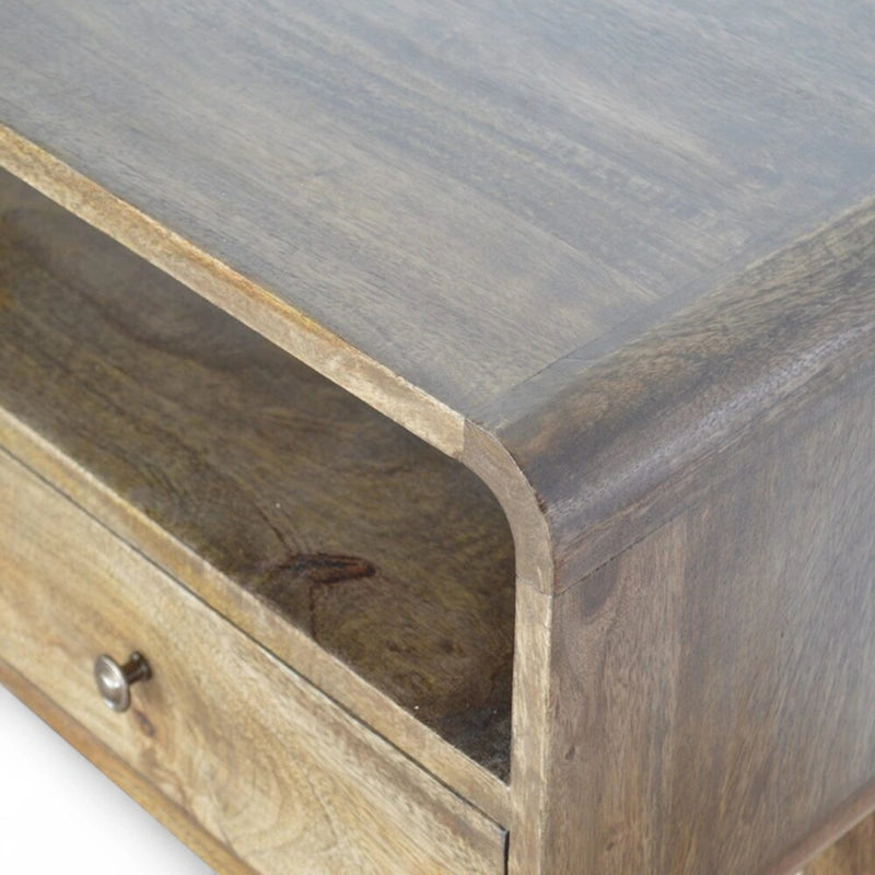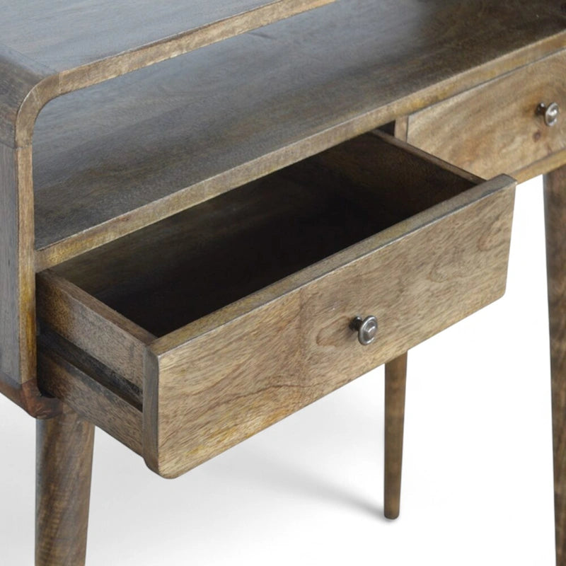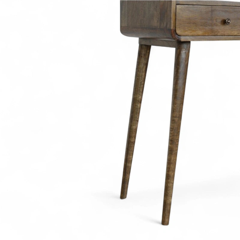 Add understated elegance to your home with this mid-century modern console table in a sophisticated grey washed finish. Its curved silhouette pairs timeless craftsmanship with a soft contemporary aesthetic, making it a versatile addition to any hallway, living room, or entryway.