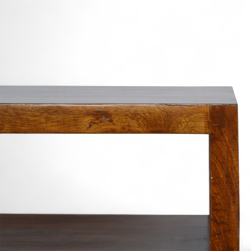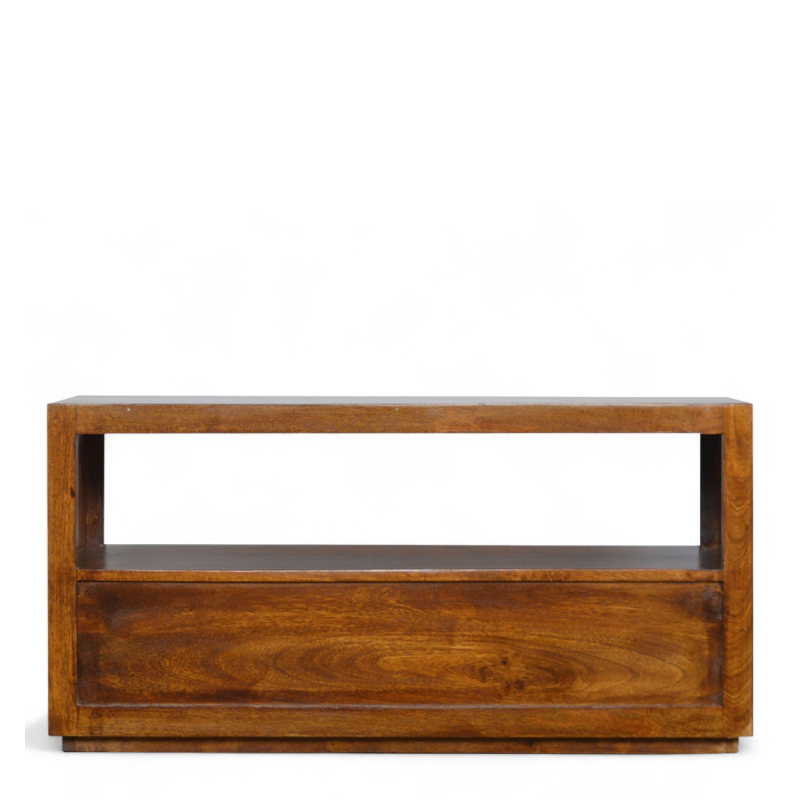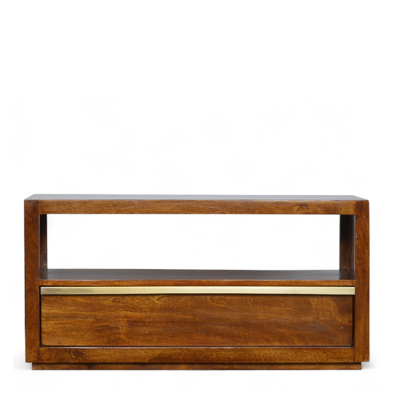 Elevate your entertainment space with the Chestnut Media Unit, crafted from solid mango wood and finished in a rich chestnut stain that enhances the natural grain. Its standout feature is the striking gold bar detail across the front, adding a touch of modern elegance to a timeless design.
