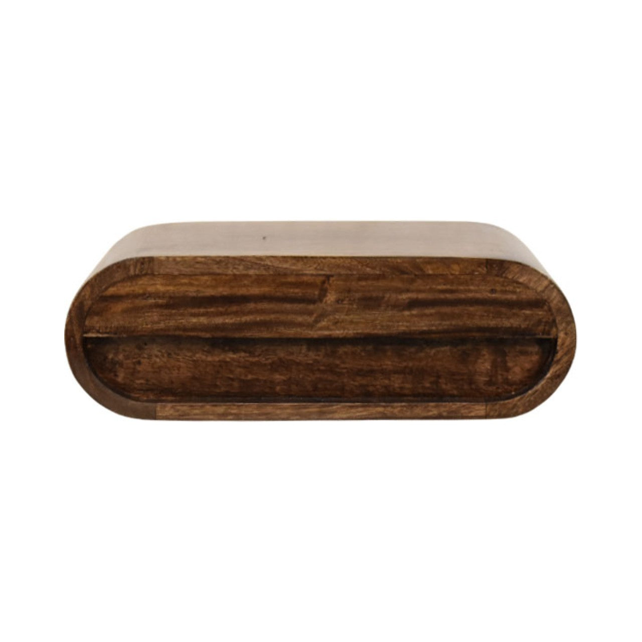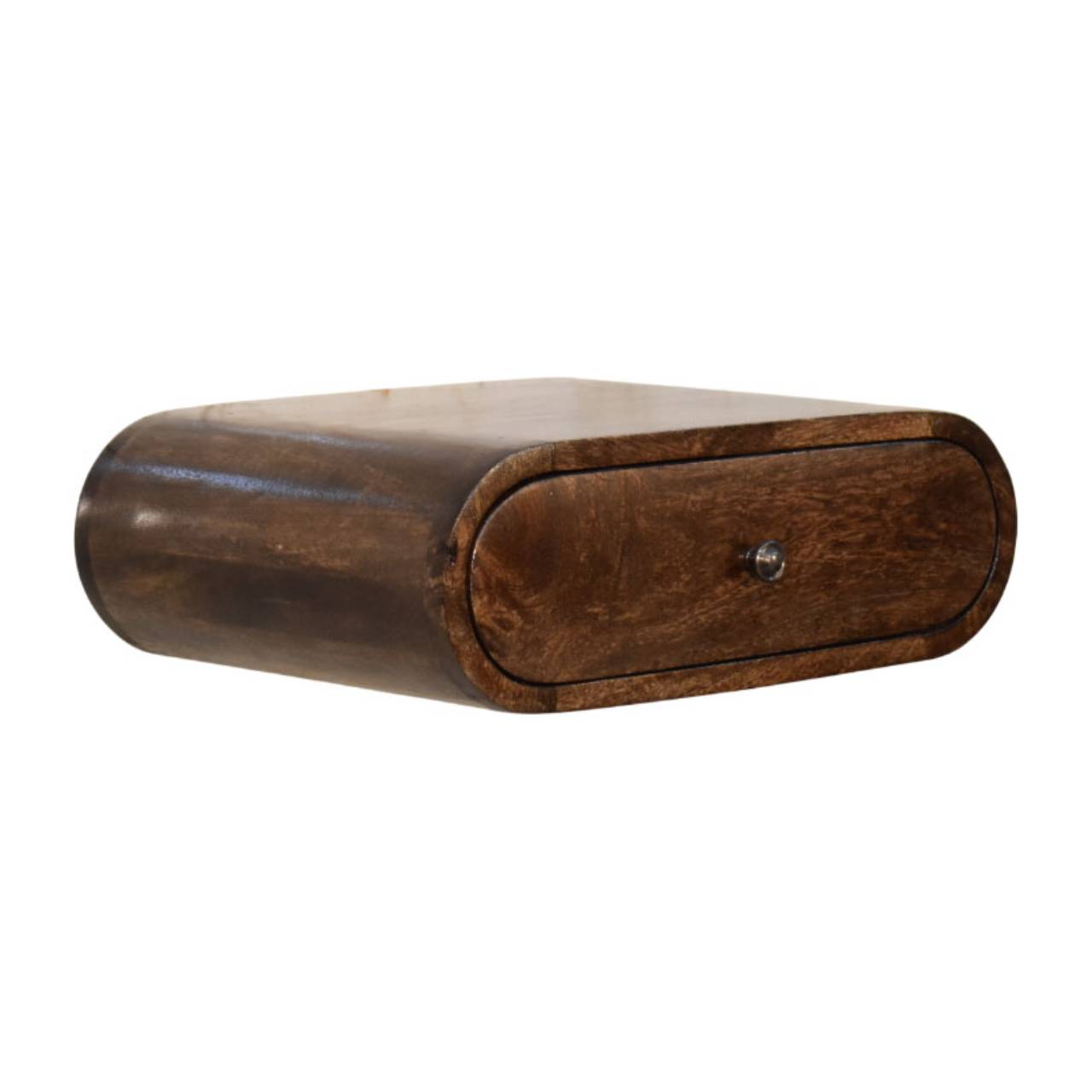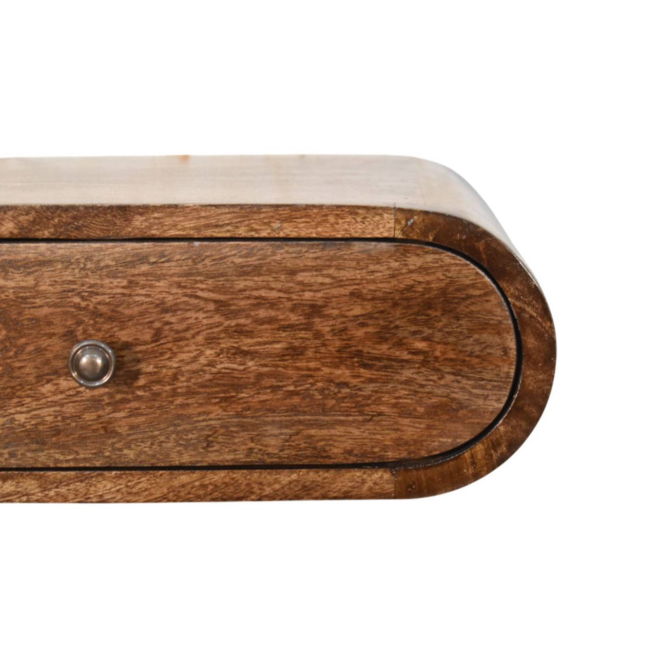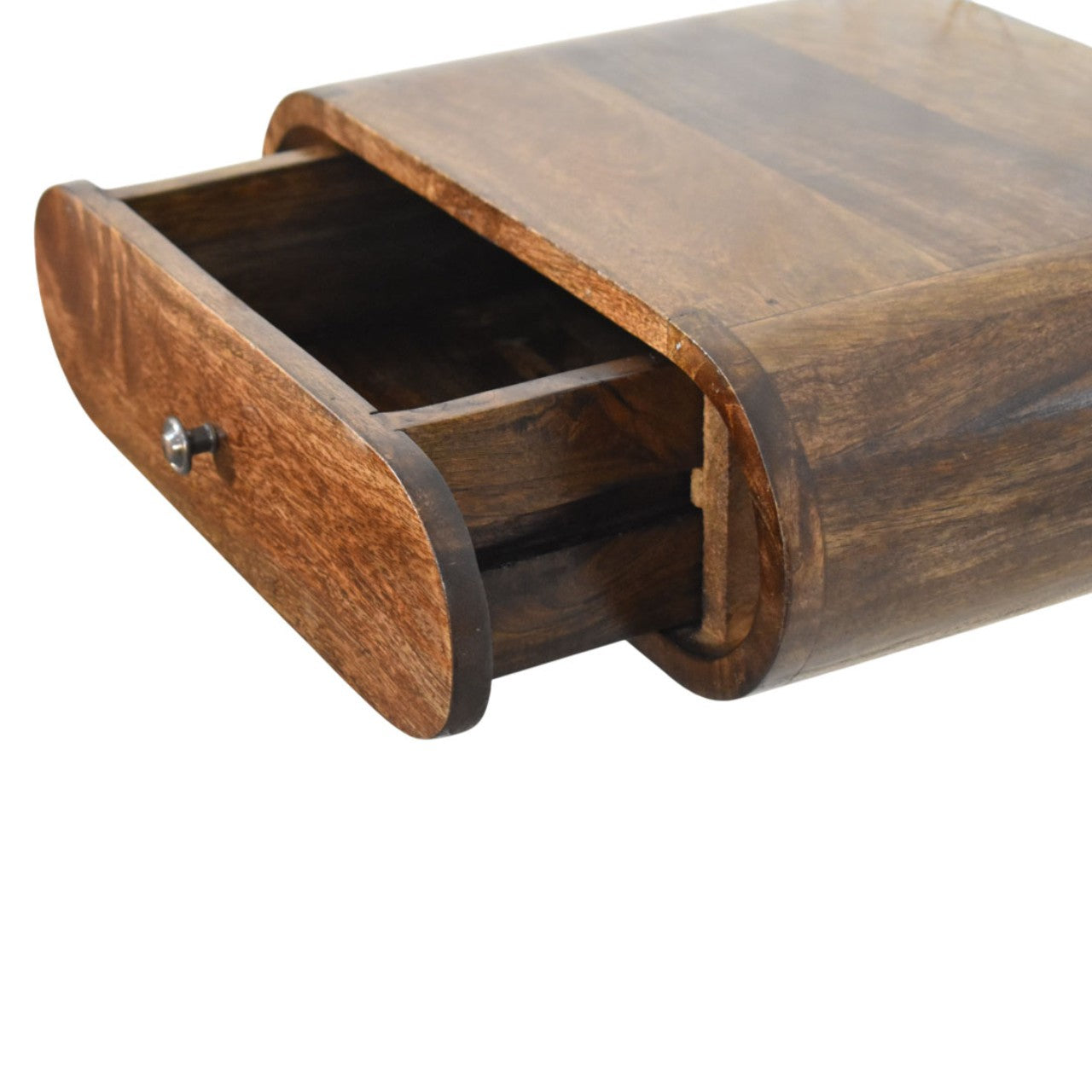 Sleek, sculptural, and space-saving, this wall-mounted bedside table is crafted from 100% solid mango wood in a refined Classic Grey finish. Its gently rounded silhouette and single push-drawer design offer a minimalist look that pairs well with modern and transitional interiors. Perfect for compact spaces, this elegant bedside keeps essentials close at hand while leaving floor space open and uncluttered. A subtle yet striking addition to elevate any bedroom setting.