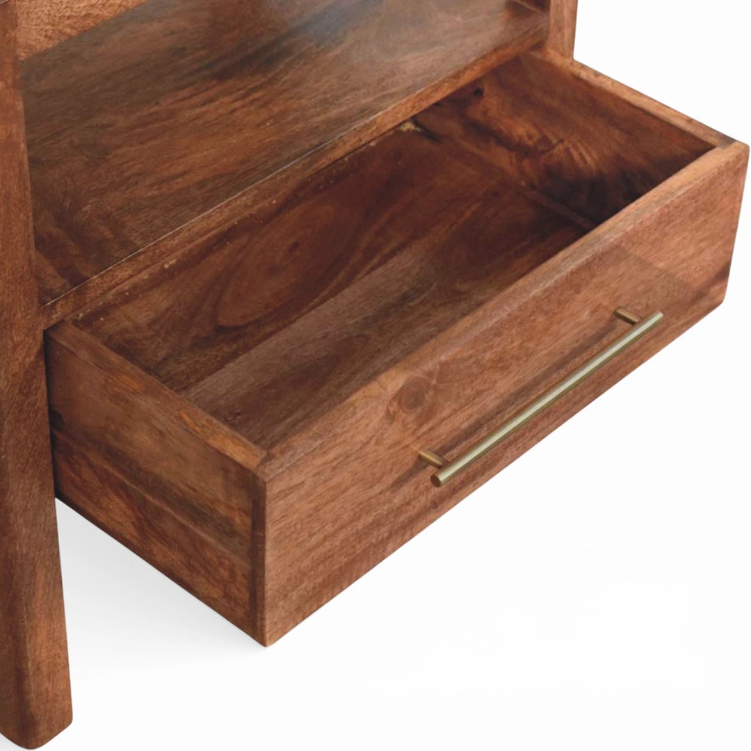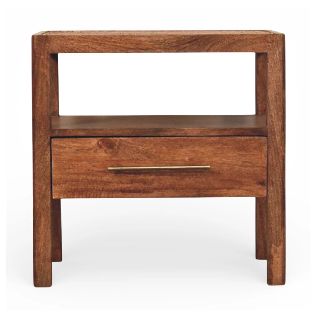 Bringing warmth and structure together, the Caldera Bedside Stand features clean, architectural lines softened by the richness of honey caramel wood. The design includes an open shelf for quick-access essentials, a deep drawer with a sleek brass-finished handle, and a rattan-inset top that adds texture and artisanal charm. Perfect for modern bedrooms seeking a grounded, handcrafted touch, this piece balances minimalism with subtle detail.