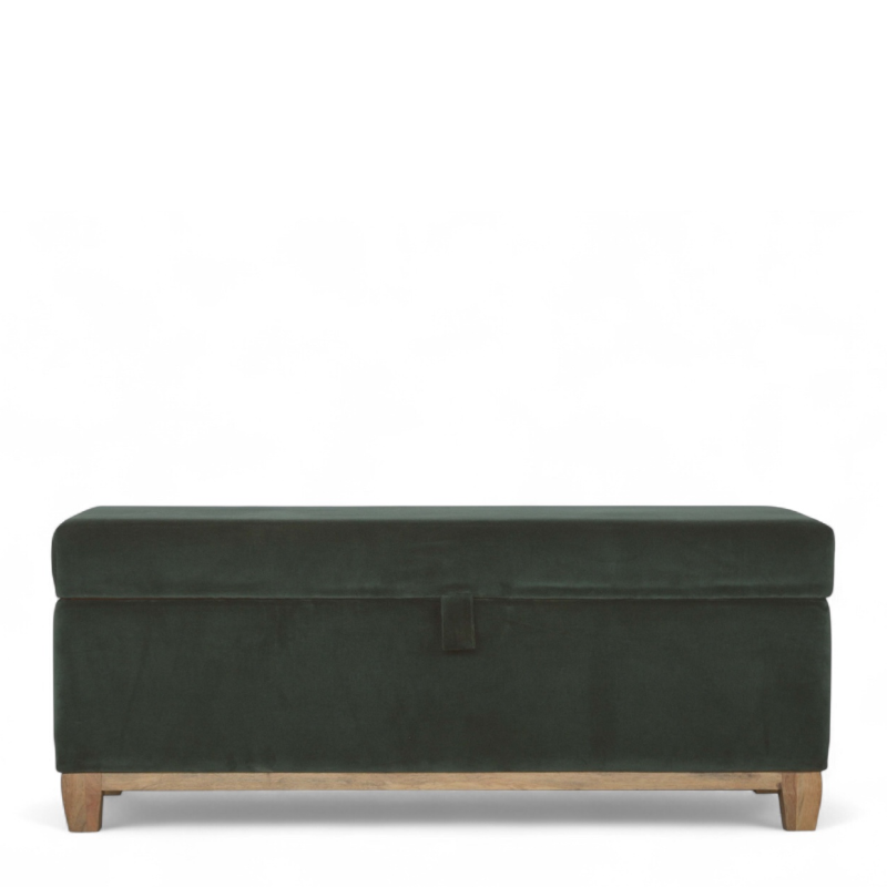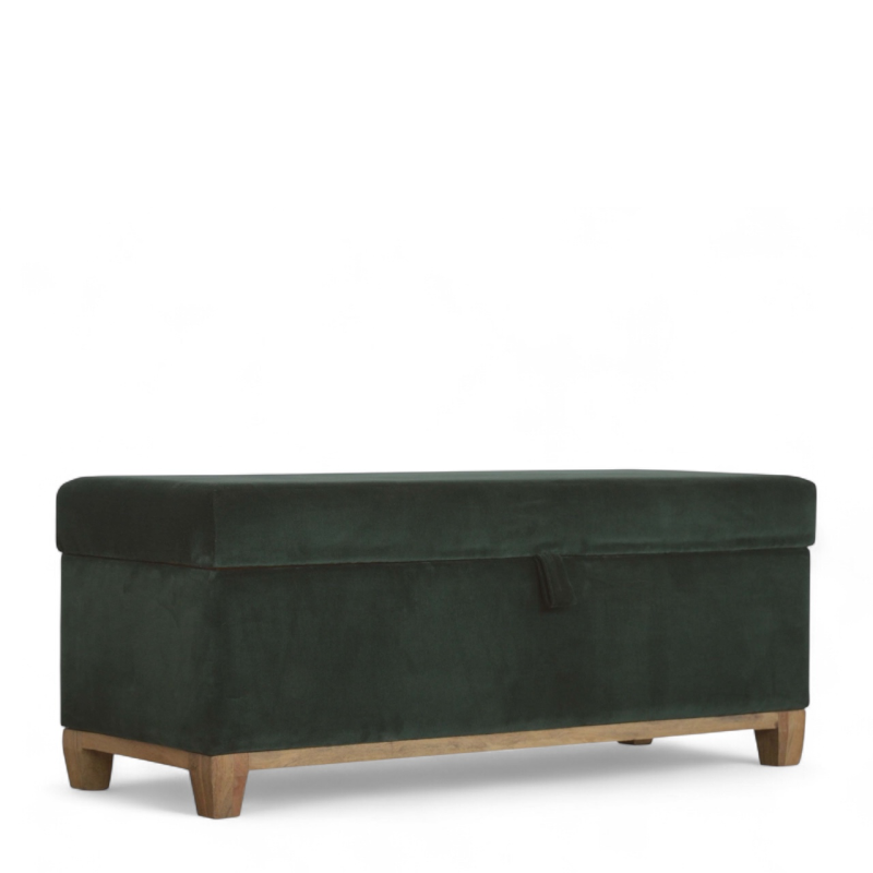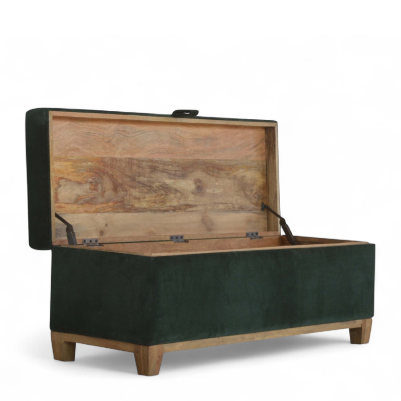 Designed with soft upholstery and a lift-up lid, it offers convenient concealed storage for throws, cushions, or accessories. The deep emerald tone complements modern, vintage, or classic interiors alike, while the sturdy frame ensures lasting quality and comfort.