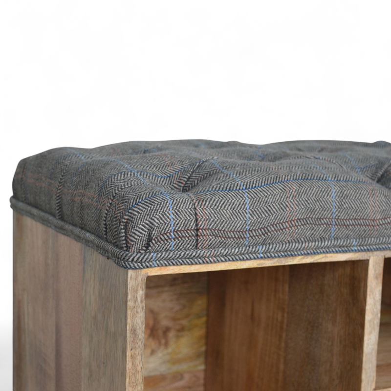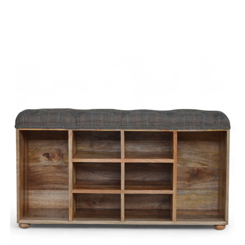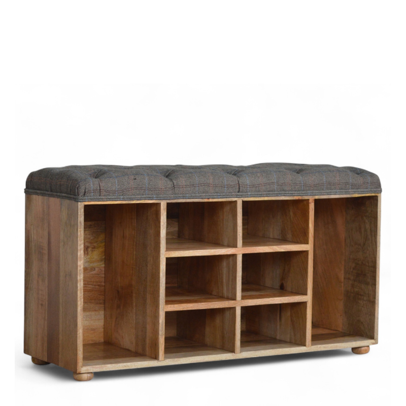 mart, stylish, and practical — this tweed shoe storage bench is the perfect solution for organizing your entryway. Upholstered in durable tweed fabric, it offers a cushioned seat for comfort while its sturdy solid wood frame ensures long-lasting use. With six built-in slots, it neatly holds shoes, keeping hallways and living spaces clutter-free.
