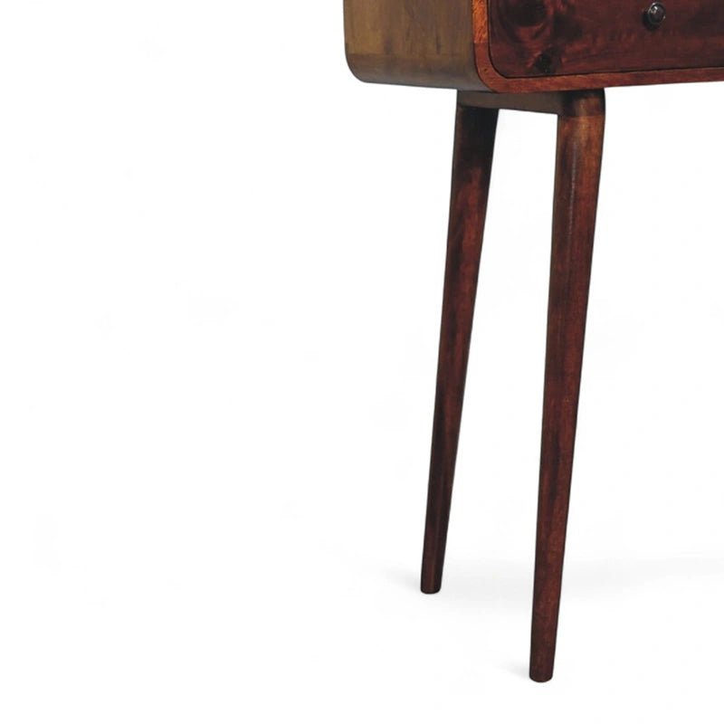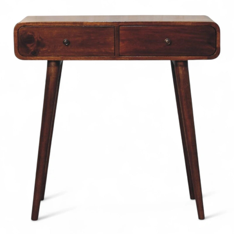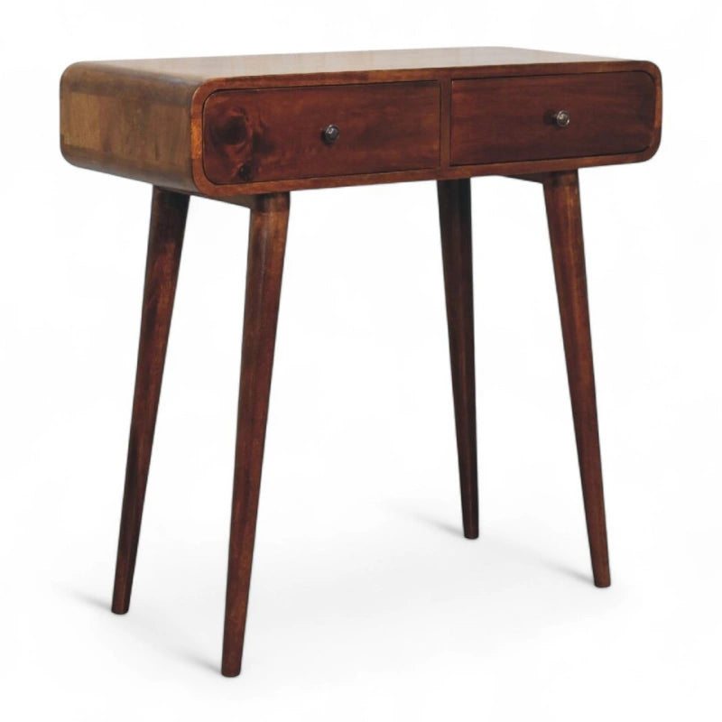 Sleek and timeless, this mid-century modern console table is crafted from rich chestnut wood and designed with a gracefully curved silhouette. Its warm finish and smooth edges create a striking balance of elegance and practicality, perfect for hallways, entryways, or living rooms.