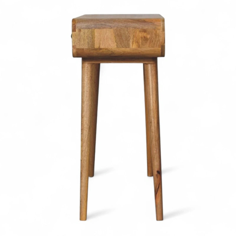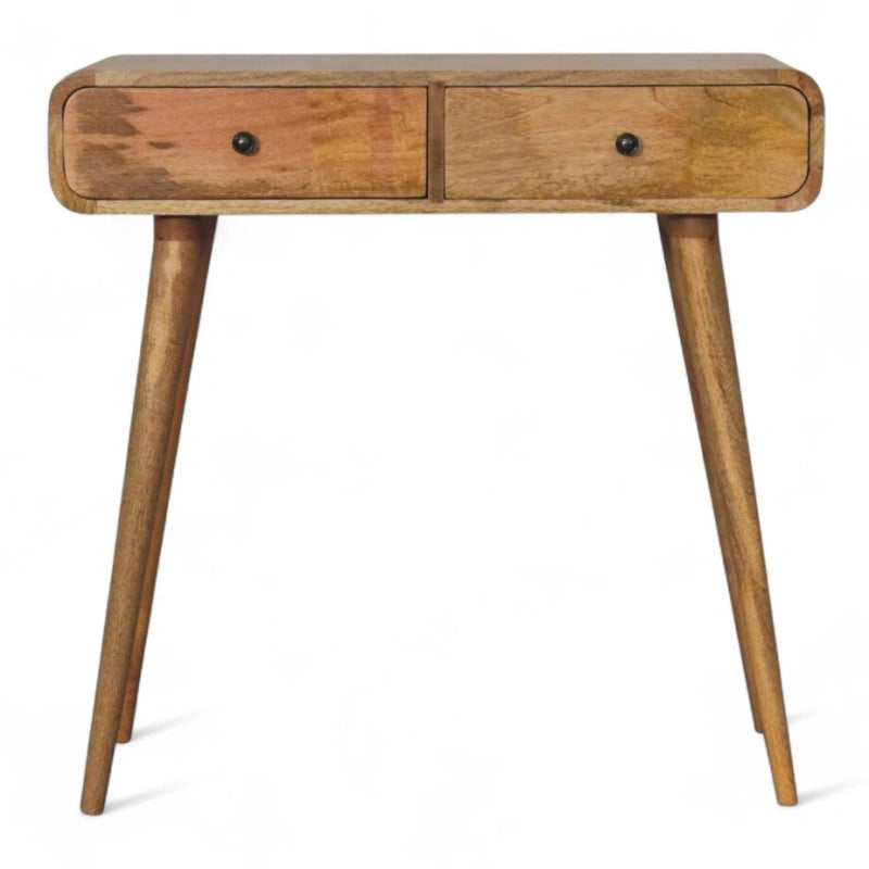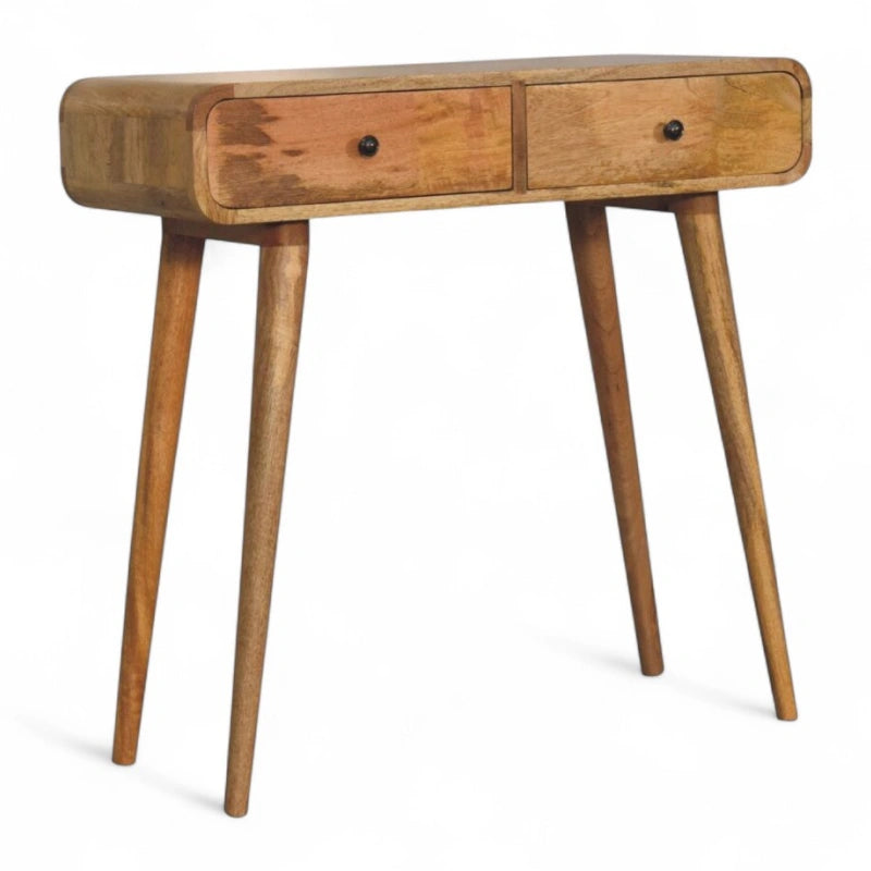 Bring timeless elegance to your entryway with this mid-century modern console table. Handcrafted from solid oak-ish wood, the gracefully curved silhouette blends Nordic simplicity with contemporary design, creating a striking yet versatile piece.