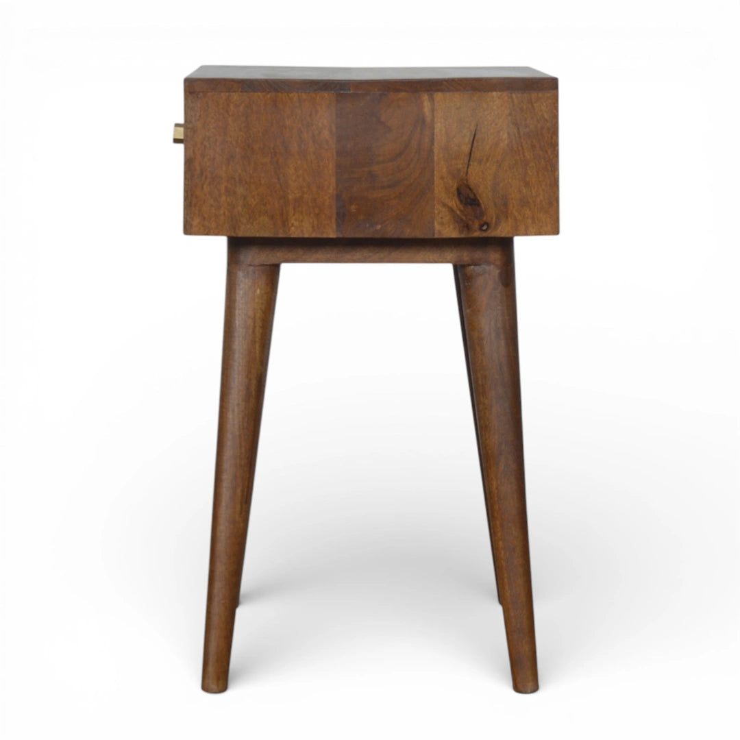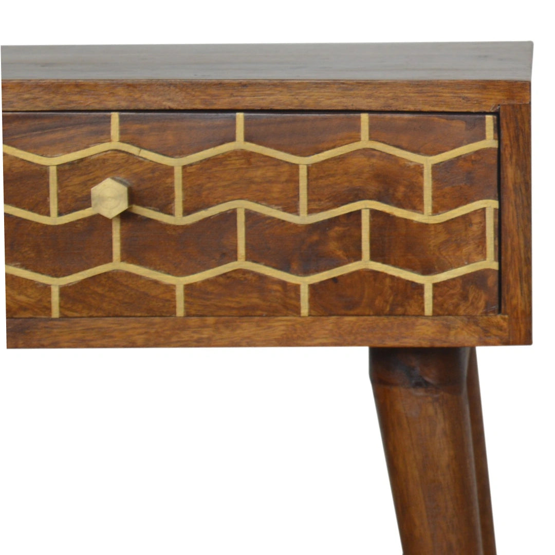 This gold pattern bedside table is handcrafted from 100% solid mango wood in a rich chestnut finish. The single drawer is detailed with a geometric golden brass inlay and a shiny brass knob, while slim Scandinavian-style legs give it a light, mid-century feel – a compact wood and gold bedside table that works beautifully in any modern bedroom.
