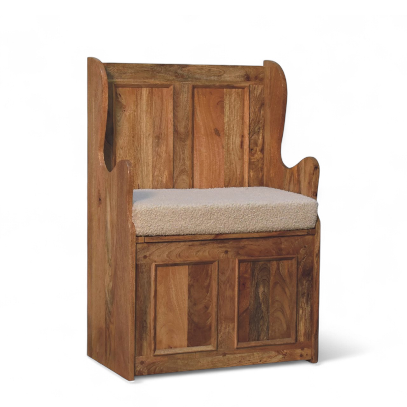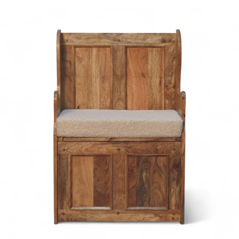 The monk’s bench design features a lift-up seat revealing hidden storage, perfect for blankets, pillows, or shoes. Its compact size makes it ideal for smaller spaces while still offering comfort and sophistication. Each bench is handmade by skilled artisans, highlighting natural wood tones and a timeless aesthetic that pairs effortlessly with soft upholstery and neutral décor.