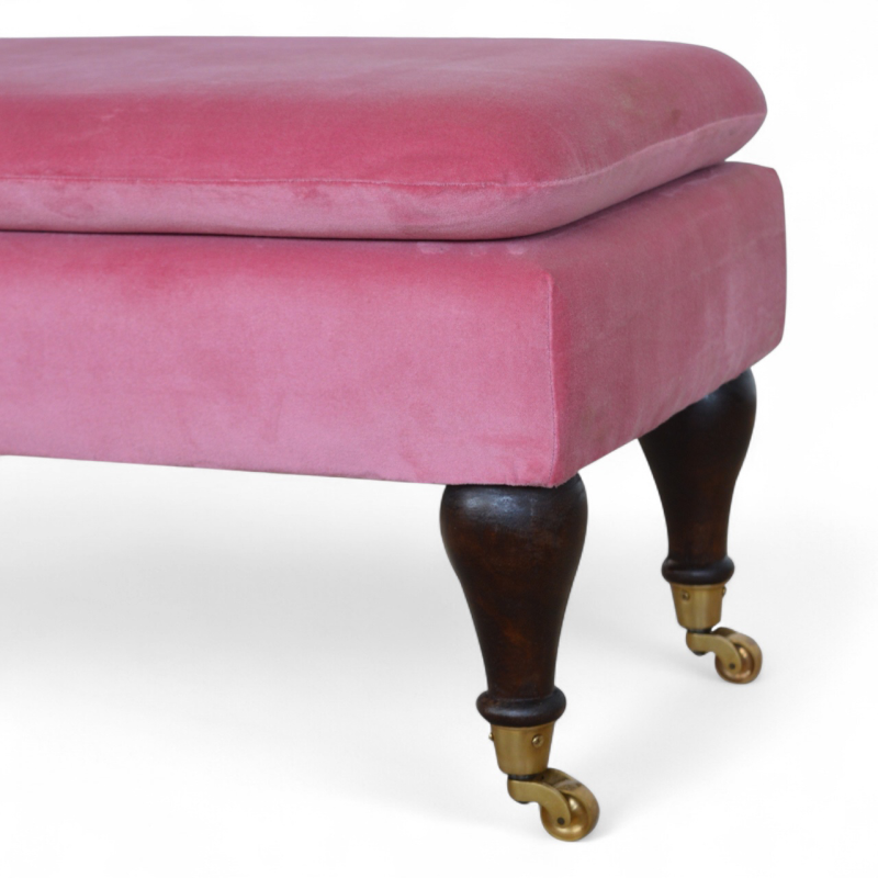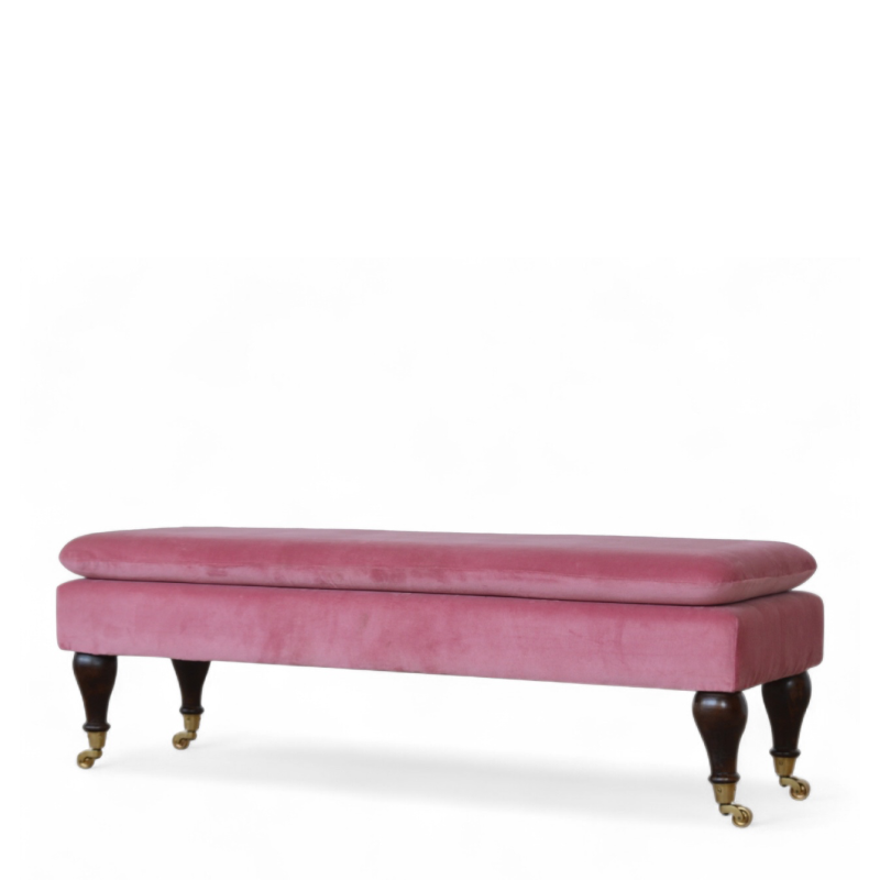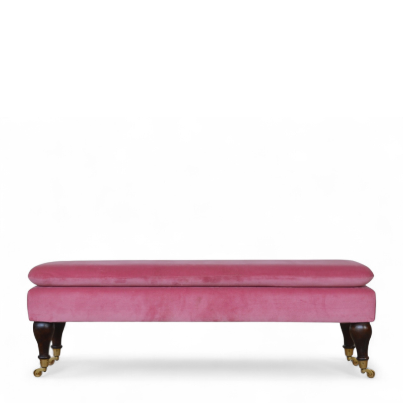 Elegant and versatile, this pink velvet bench brings a touch of mid-century modern style to any interior. Upholstered in soft velvet for a luxurious feel, it rests on sturdy castor legs, allowing easy mobility while maintaining classic sophistication. The bold pink hue adds a playful yet refined accent, making it perfect for bedrooms, dressing areas, or entryways.