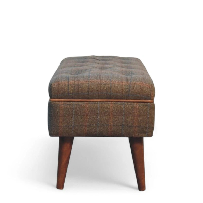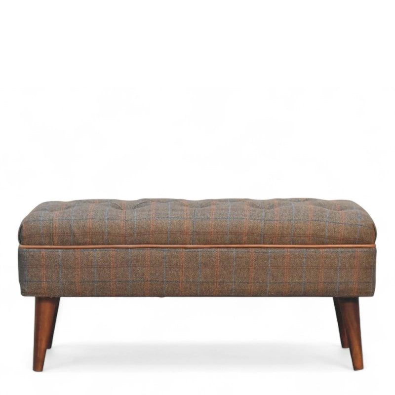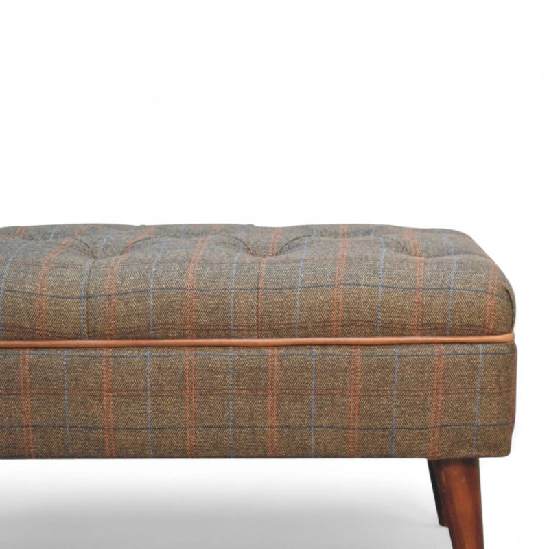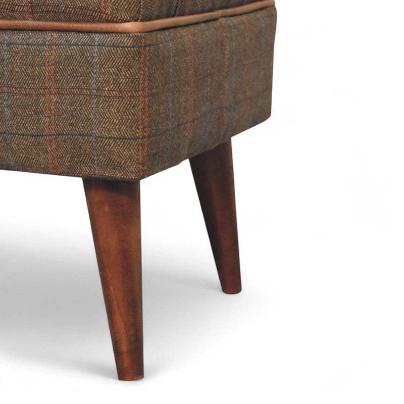 Bring texture and charm into your home with this mid-century modern bench, upholstered in multi-toned tweed and finished with buffalo leather piping. Its hand-tufted top and sturdy solid wood legs combine durability with timeless design, creating a versatile piece for modern interiors.