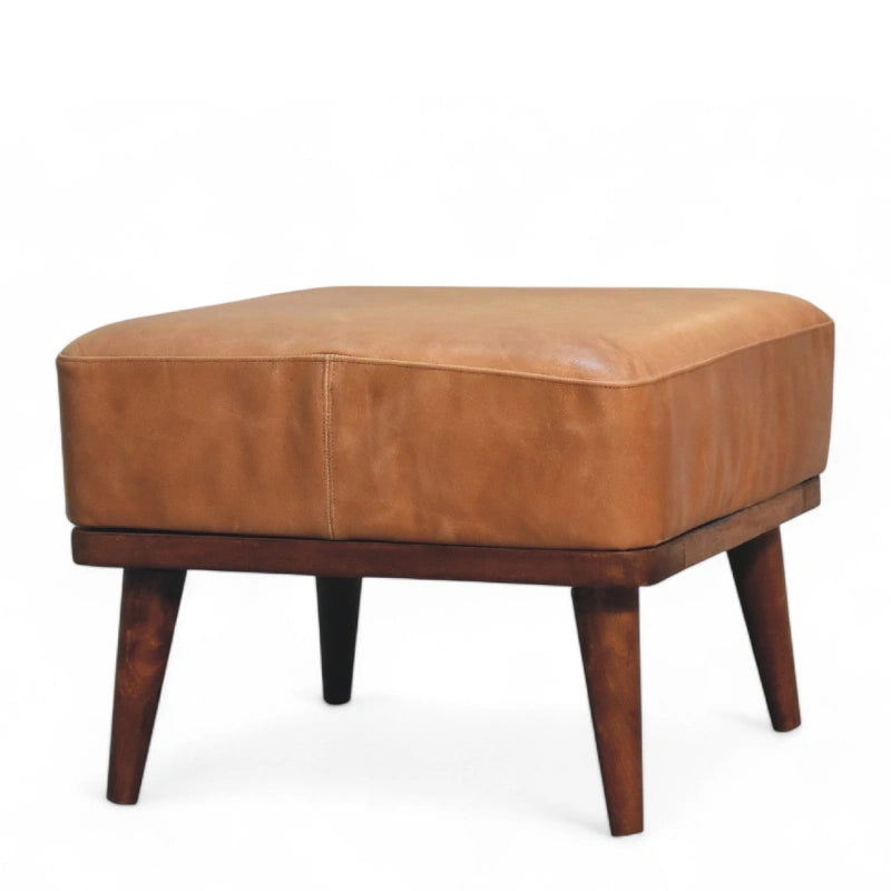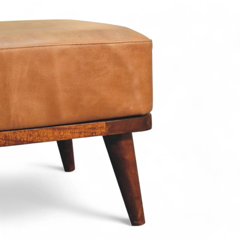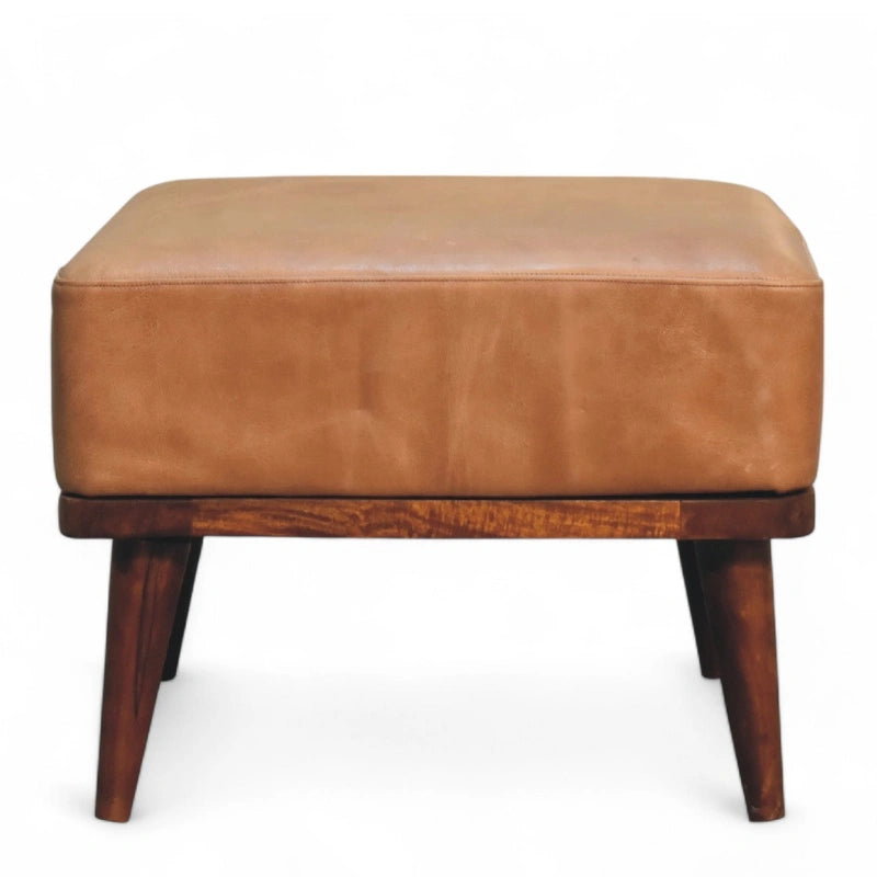 Classic design meets comfort. This mid-century footstool is upholstered in premium tan buffalo leather, offering a soft yet durable finish that ages beautifully over time. The warm leather tones complement a wide range of interiors, from modern to rustic.