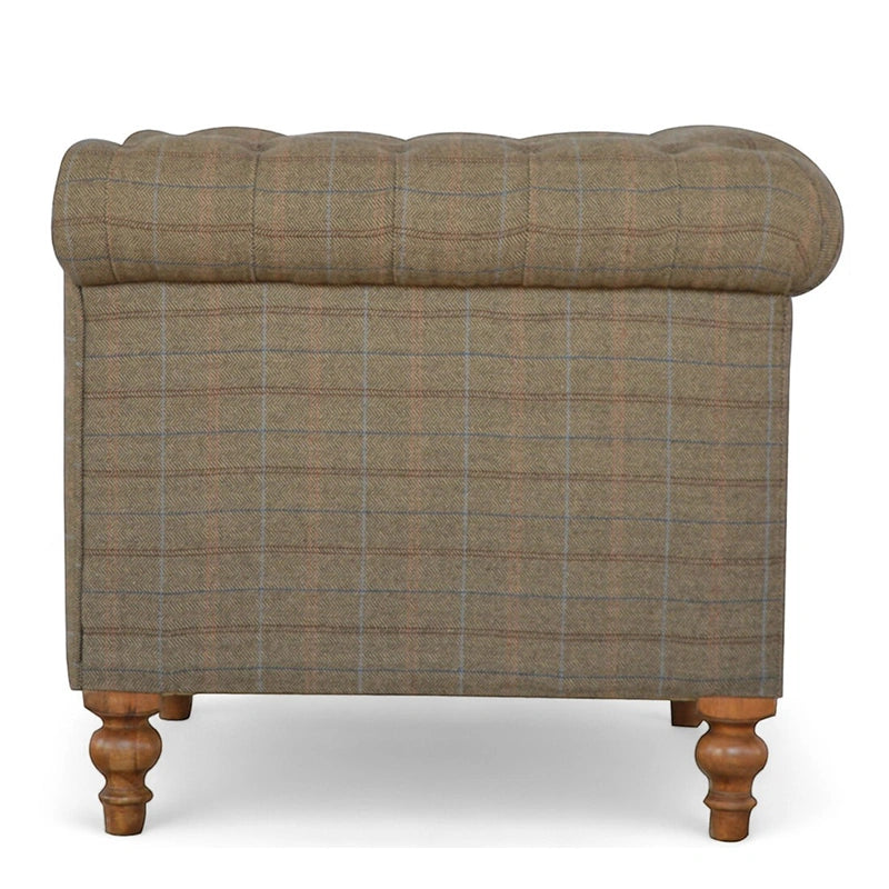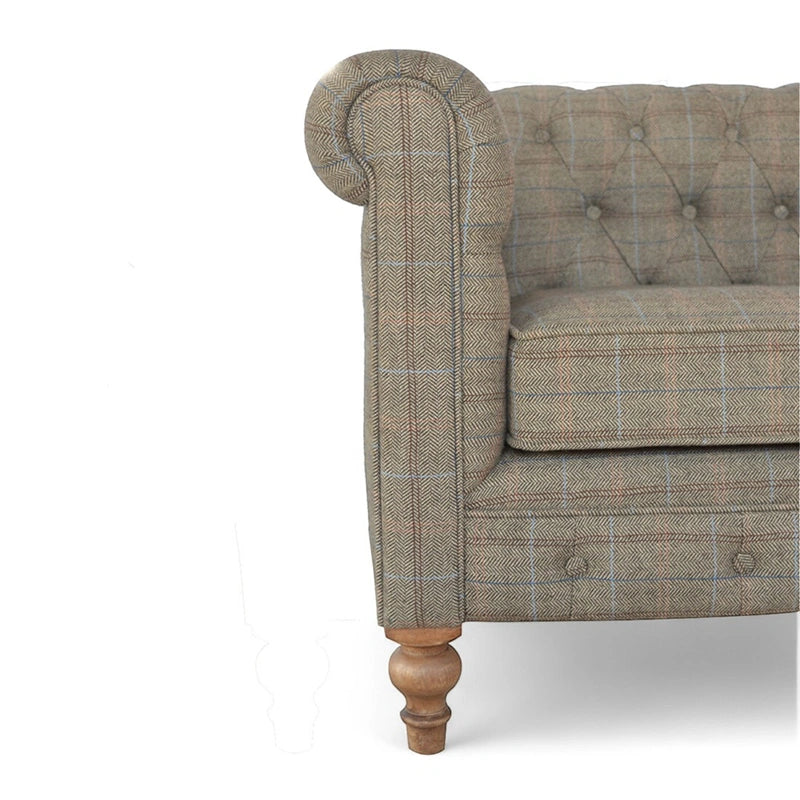 The Multi Tweed Chesterfield Sofa captures the essence of timeless British design with handcrafted detail. Upholstered in premium multi-toned tweed fabric, it features deep button tufting, scroll arms, and turned wooden legs for an elegant, classic finish. The solid mango wood frame ensures durability and lasting comfort.