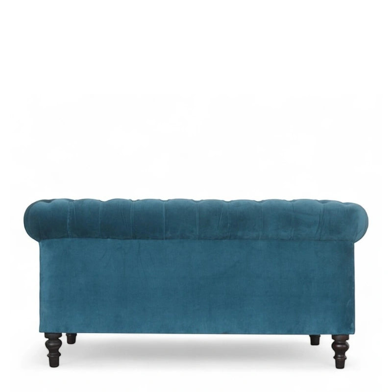 The Teal Chesterfield Sofa brings classic elegance and modern comfort together. Upholstered in luxurious teal cotton velvet, it features deep button tufting, scroll arms, and turned wooden legs. Handcrafted with a solid wood frame, this sofa offers exceptional durability and timeless style.