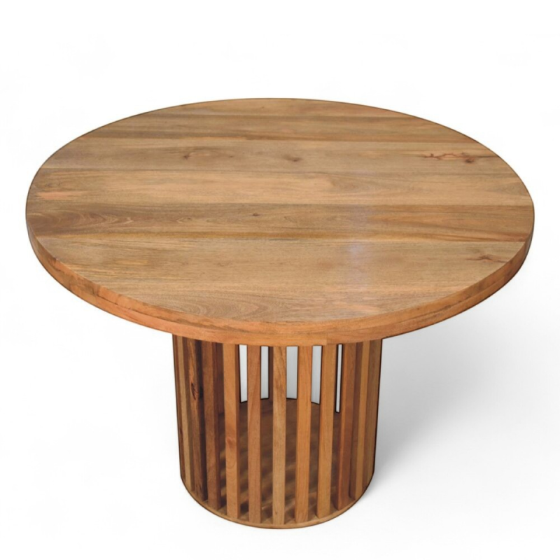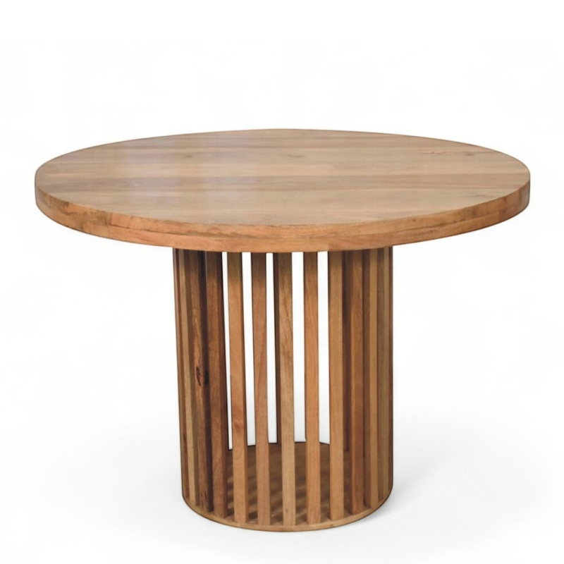 Stylish and timeless, the Ariella Round Dining Table is the perfect blend of form and function. Handcrafted from solid mango wood, it features a smooth circular top supported by a sturdy pedestal base. The natural finish highlights the unique character of the wood grain, giving each table a one-of-a-kind look.
