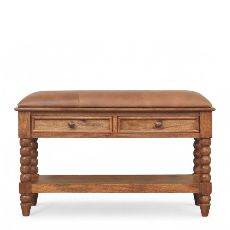 The seat is upholstered in genuine brown leather, creating a warm and sophisticated contrast to the natural wood grain. Ideal for entryways, bedrooms, or living spaces, this leather accent bench serves as both a statement piece and a functional addition to your home. Its classic silhouette and artisanal finish make it a versatile favorite for mid-century, rustic, or industrial interiors.