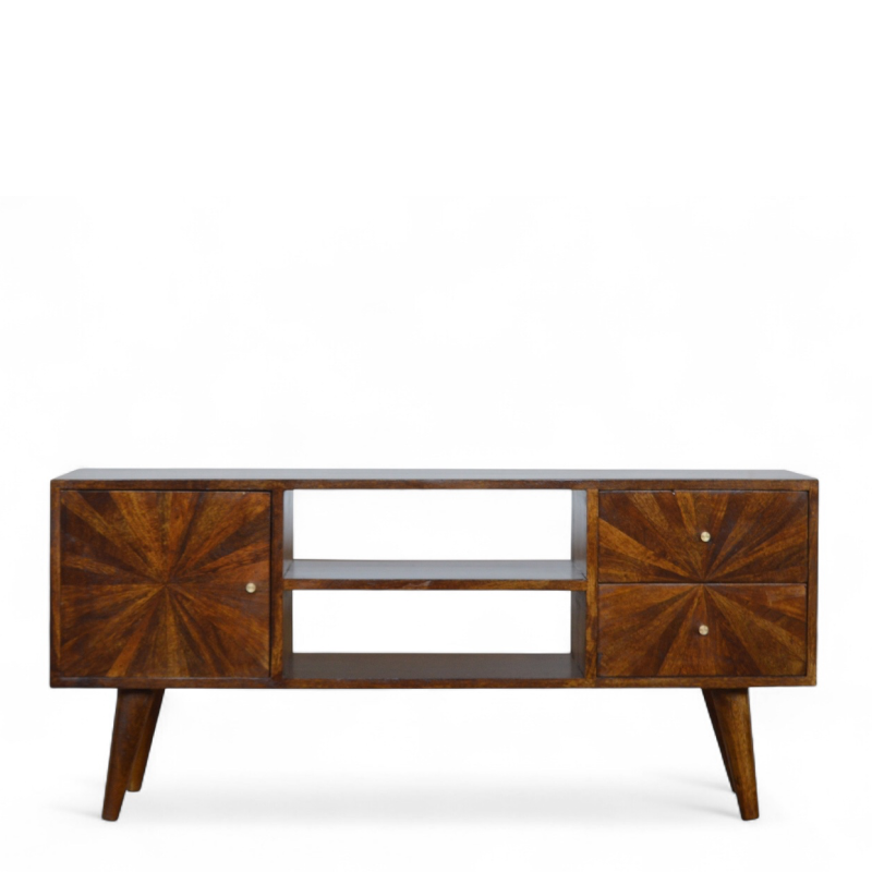 Infuse warmth and artistry into your living room with the Chestnut Sunrise TV Stand. Crafted from solid mango wood, it features a deep chestnut finish that enhances the wood’s natural grain while ensuring durability. The standout design element is its hand-carved sunrise motif, giving the piece a bold mid-century modern aesthetic.