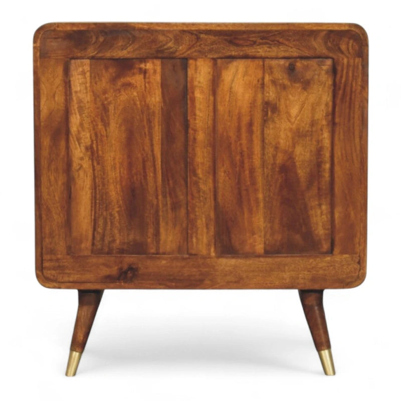Bold and artistic, this mid-century modern cabinet is crafted from rich chestnut wood and finished with intricate brass embossing on its double doors. The Avora design combines striking textures with timeless craftsmanship, creating a true statement piece.