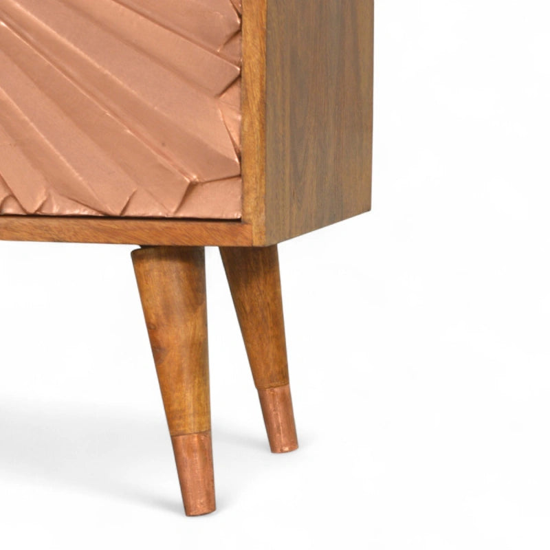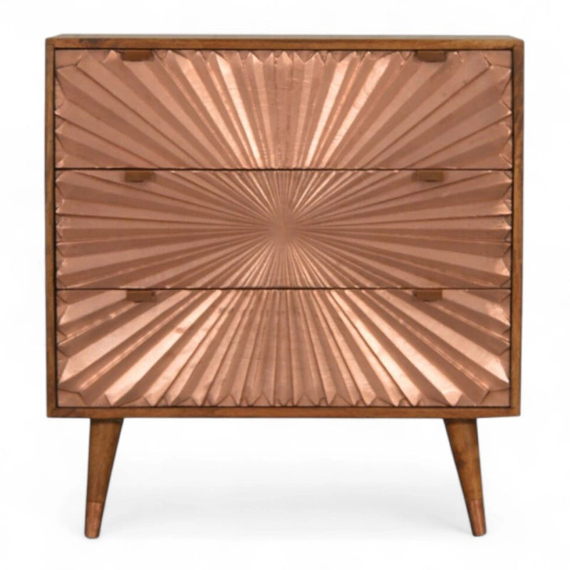 Add a touch of luxury to your bedroom with this mid-century modern dresser, featuring a sleek rose gold inlay against a rich wood finish. The Manila chest combines elegant design with practical storage, making it both stylish and functional.