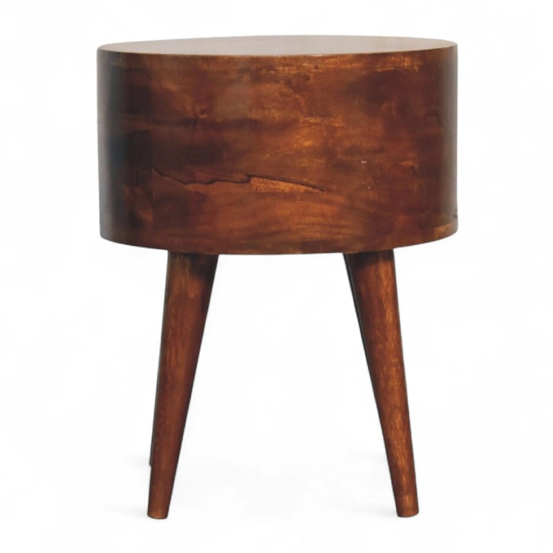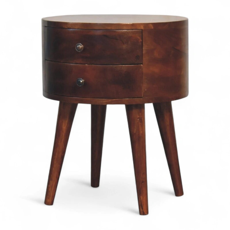 Expertly crafted from solid mango wood in a rich chestnut finish, it features two smooth-gliding drawers accented with minimal brass knobs. Perfect as a nightstand, bedside table, or bedside cabinet, it offers both beauty and function with its compact yet spacious design. Hand-finished details highlight the natural wood grain, making each piece unique.
