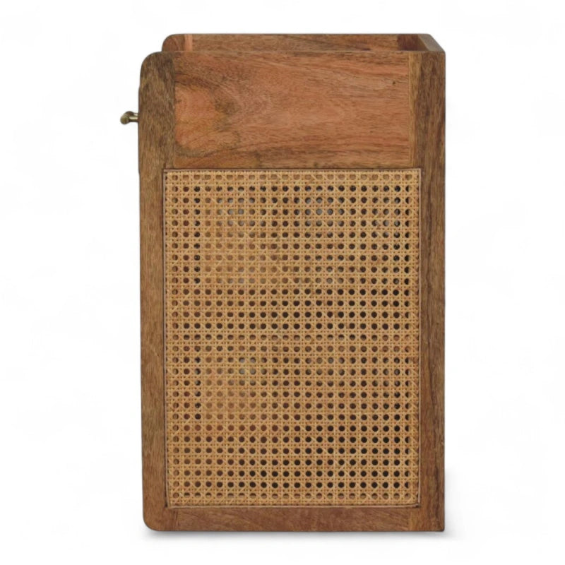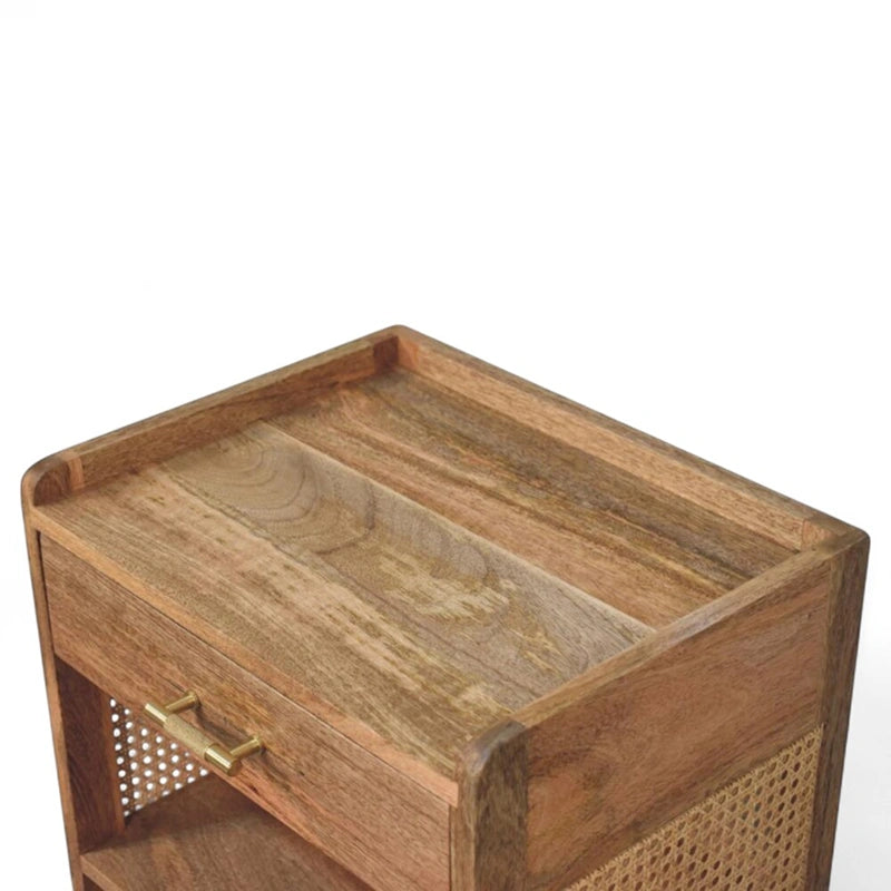 Crafted from solid mango wood with a warm chestnut finish, it features an open shelf framed by a distinctive T-bar design. The natural grain patterns and hand-finished craftsmanship highlight its quality, while the open structure makes it ideal for storing books, decor, or essentials within easy reach. Whether you call it a nightstand, bedside table, or bedside cabinet, this piece balances style with everyday functionality.