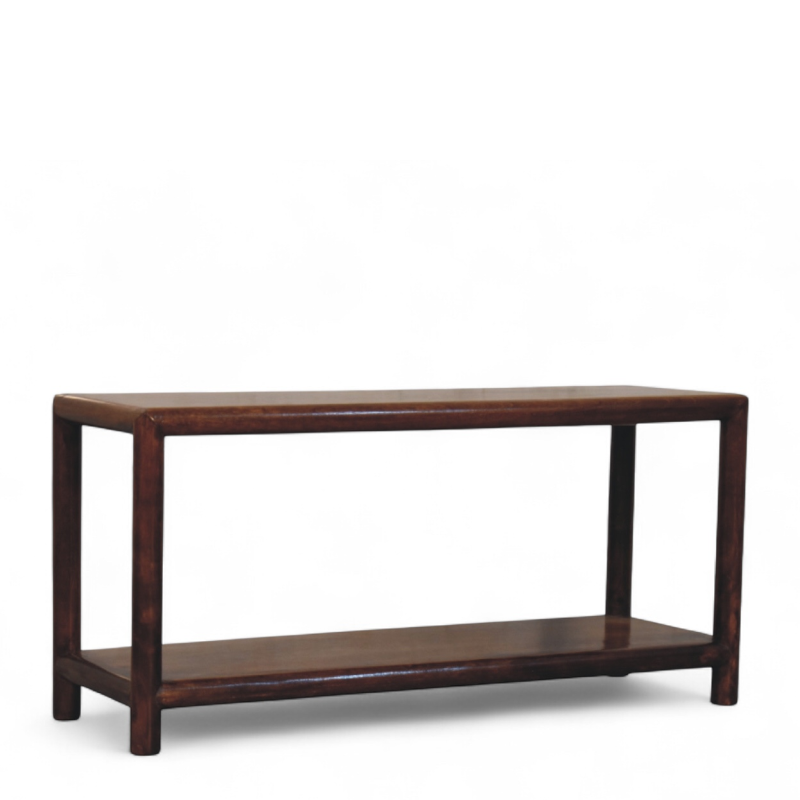 Refined and versatile, this Regency bench brings timeless mid-century modern style to any room. Handcrafted from solid mango wood, it features a smooth chestnut finish that enhances the natural grain, paired with a clean silhouette for understated elegance. Designed with both durability and style in mind, it serves as a sophisticated accent piece for your home.