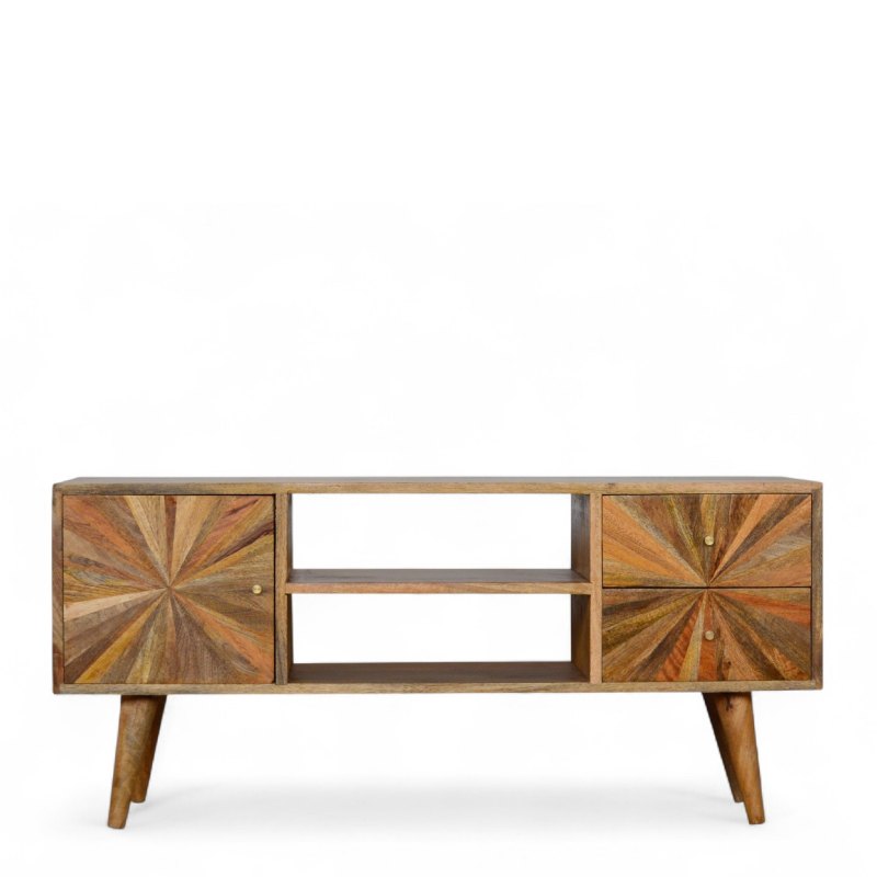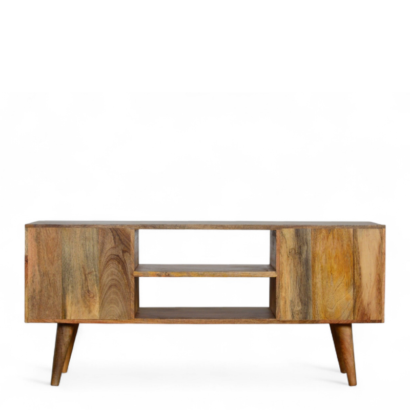 Bring timeless elegance to your living room with the Sunrise TV Stand, crafted in solid mango wood with a smooth natural finish. Its clean lines and warm tones highlight the beauty of hand craftsmanship, making it a centerpiece that blends seamlessly with mid-century modern and Scandinavian interiors.