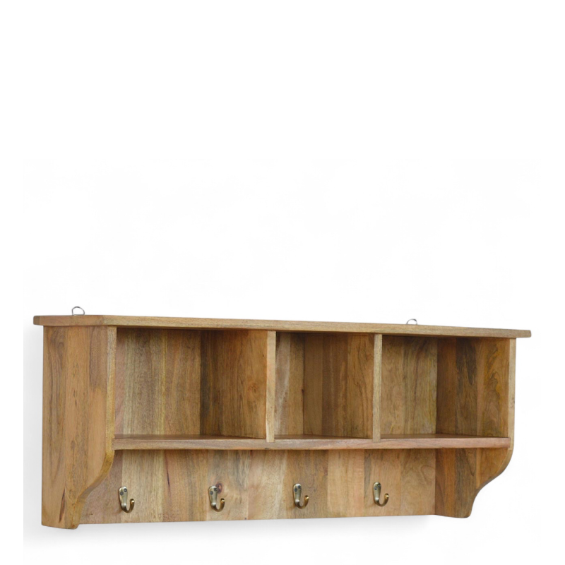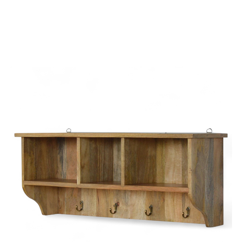 Featuring three open shelves and multiple coat hooks, this wall mounted coat rack is perfect for keeping jackets, scarves, hats, and accessories neatly arranged. Its sturdy wooden build and handcrafted details highlight artisan craftsmanship, while the minimalist design fits seamlessly into modern, Scandinavian, and vintage-inspired interiors.