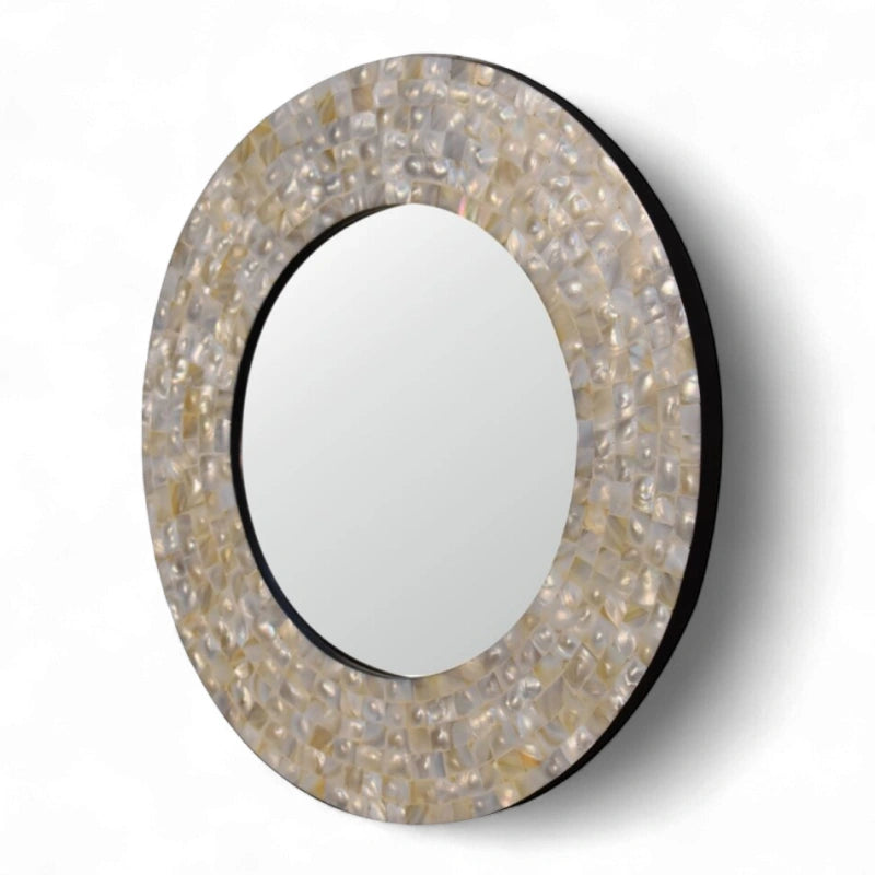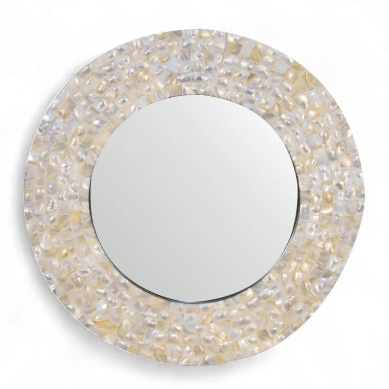 Bring artisanal beauty into your home with this handcrafted mosaic wall mirror. Featuring a delicately inlaid mosaic border, this piece combines functionality with elegance. Its compact size makes it perfect for hallways, bedrooms, or living rooms, where it adds depth, light, and artistic flair to any space.