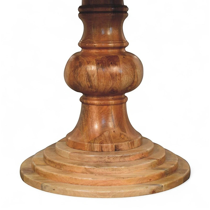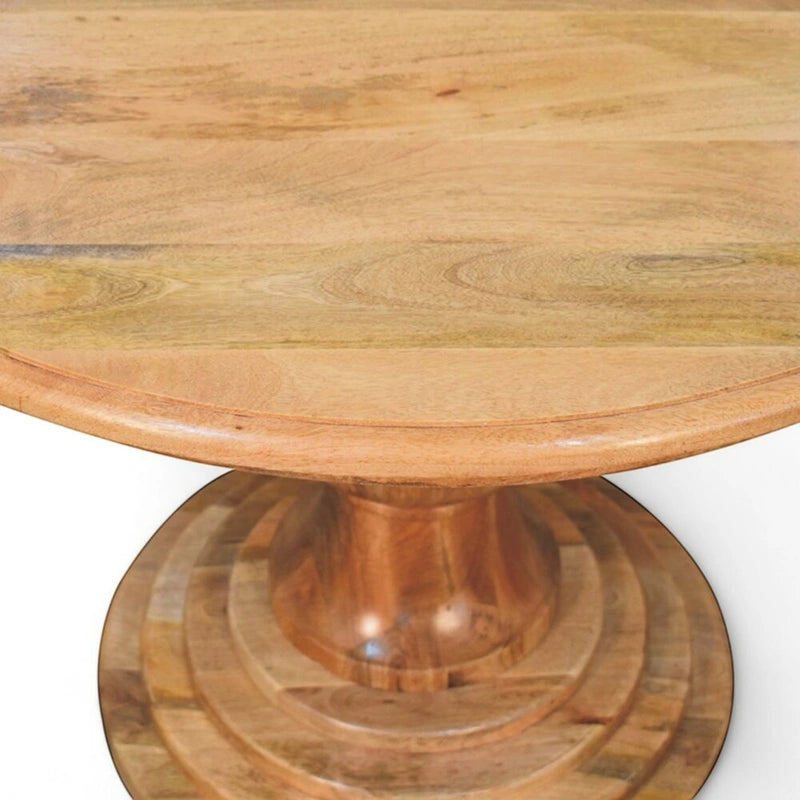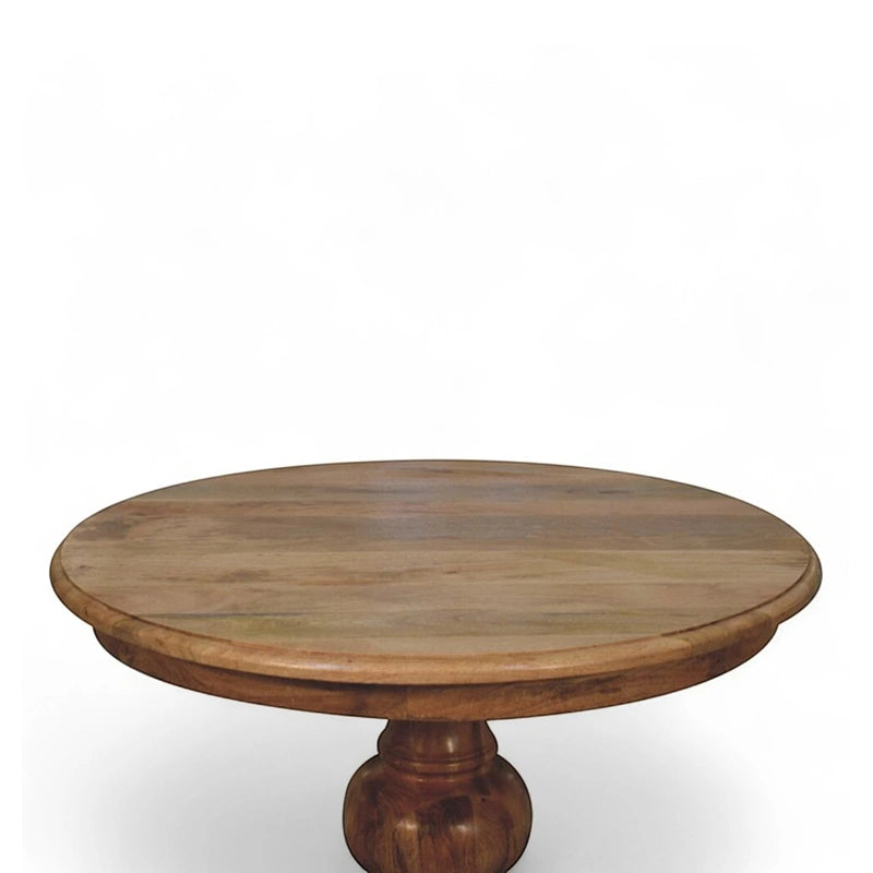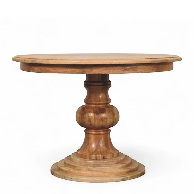 Classic design meets artisanal craftsmanship in this round turned dining table. Handcrafted from solid mango wood, it features a beautifully rounded tabletop supported by an elegant turned pedestal base. The natural finish enhances the wood’s grain, offering warmth and sophistication for your dining space.
