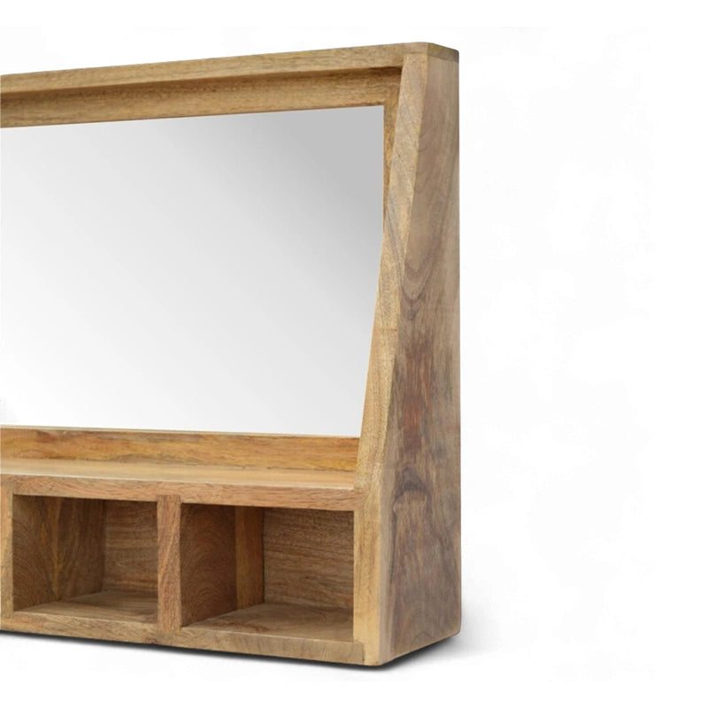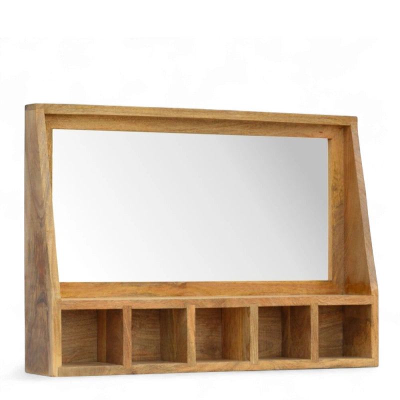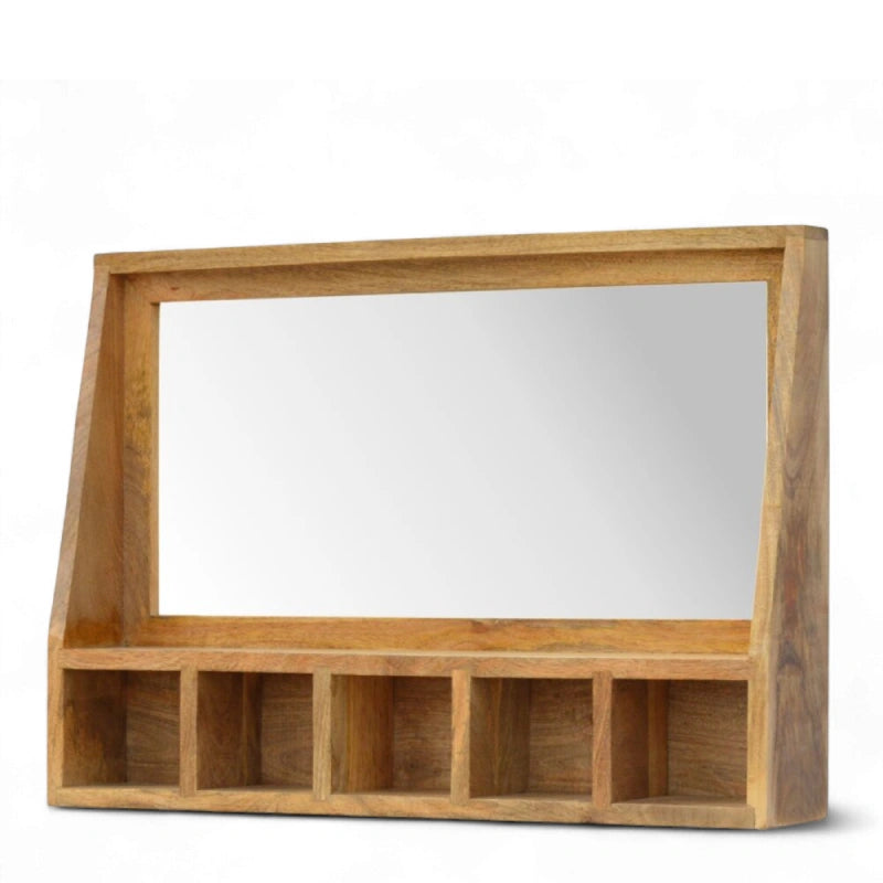 Practical and stylish, this solid wood wall mounted unit with mirror combines smart storage with timeless design. Featuring five open slots and a central mirror, it is perfect for organizing keys, mail, or décor while adding light and depth to your hallway, entryway, or bedroom.