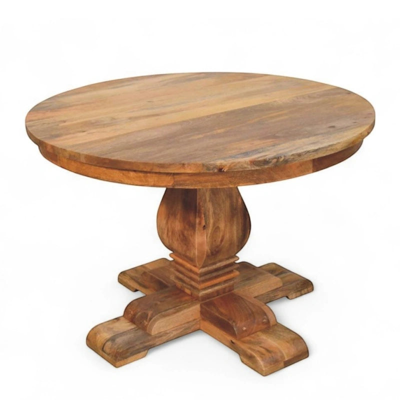 Elegant and timeless, the Valentina Round Dining Table brings sophistication to any dining space. Handcrafted from solid mango wood, it features a beautifully rounded top and a sturdy pedestal base that offers stability and style. The natural finish highlights the rich wood grain, ensuring each piece is unique.