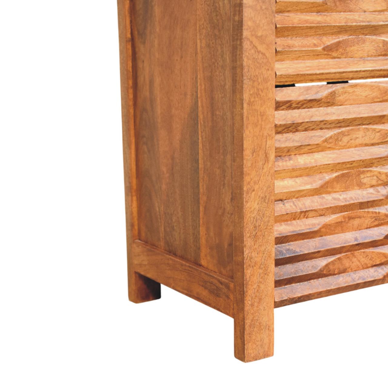 Crafted from 100% solid mango wood in a rich Amber Oak finish, the Amber Wavefront brings both beauty and utility into your home. Its hand-carved wave pattern creates a striking texture, while the brass-finished handles add a refined touch. Behind its sleek front, generous compartments provide organized storage for footwear, helping keep your entryway clean and inviting. A perfect blend of artistry and practicality, this piece is designed to stand out while serving everyday needs. Height: 73 cm, Width: 90 cm, Depth: 35 cm Carton Height: 83 cm, Carton Width: 100 cm, Carton Depth: 45 cm