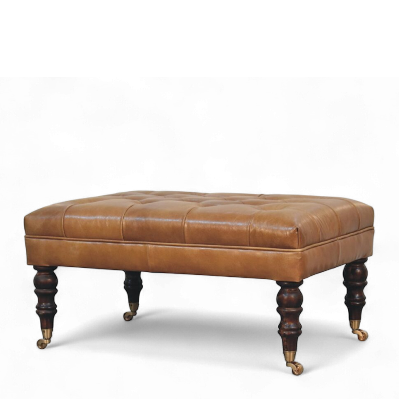 Elegant and versatile, this buffalo green leather ottoman combines luxurious comfort with traditional craftsmanship. Upholstered in genuine buffalo leather with a deep green tone, it is accented with brass studs and rests on smooth castor legs for mobility. The California walnut finish enhances its classic character, making it a refined addition to any space.