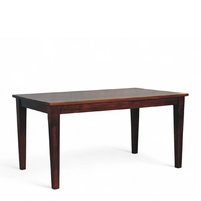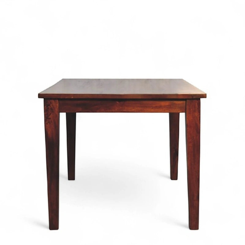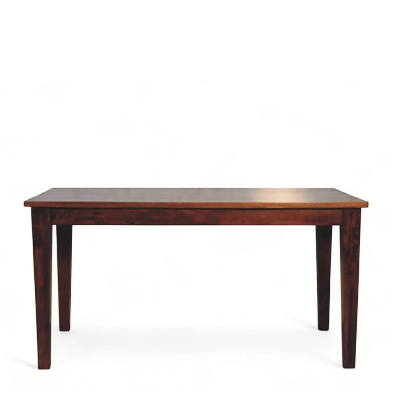 The Chestnut Dining Table is a timeless blend of durability and elegance. Handcrafted from solid mango wood, it features a smooth rectangular top and a rich chestnut finish that enhances the natural beauty of the grain. Designed with simplicity in mind, it provides a warm and inviting centerpiece for your dining space.