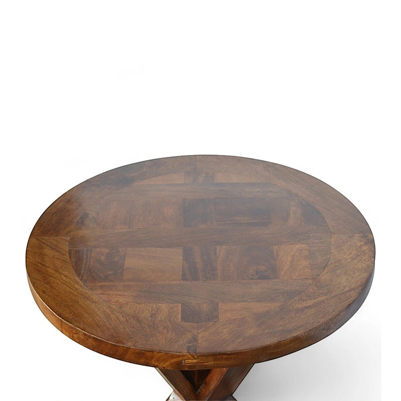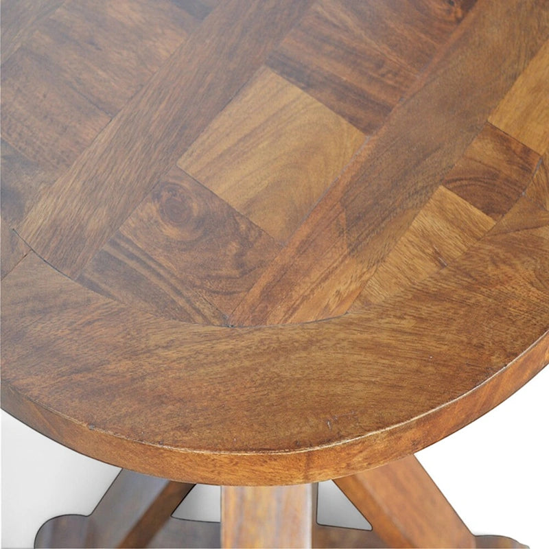 Traditional craftsmanship and elegant design define this chestnut round dining table with tristle base. Handcrafted from solid mango wood, it features a smooth round top and a beautifully carved pedestal-style tristle base. The chestnut finish enhances the rich tones of the wood, making this table both durable and timeless.