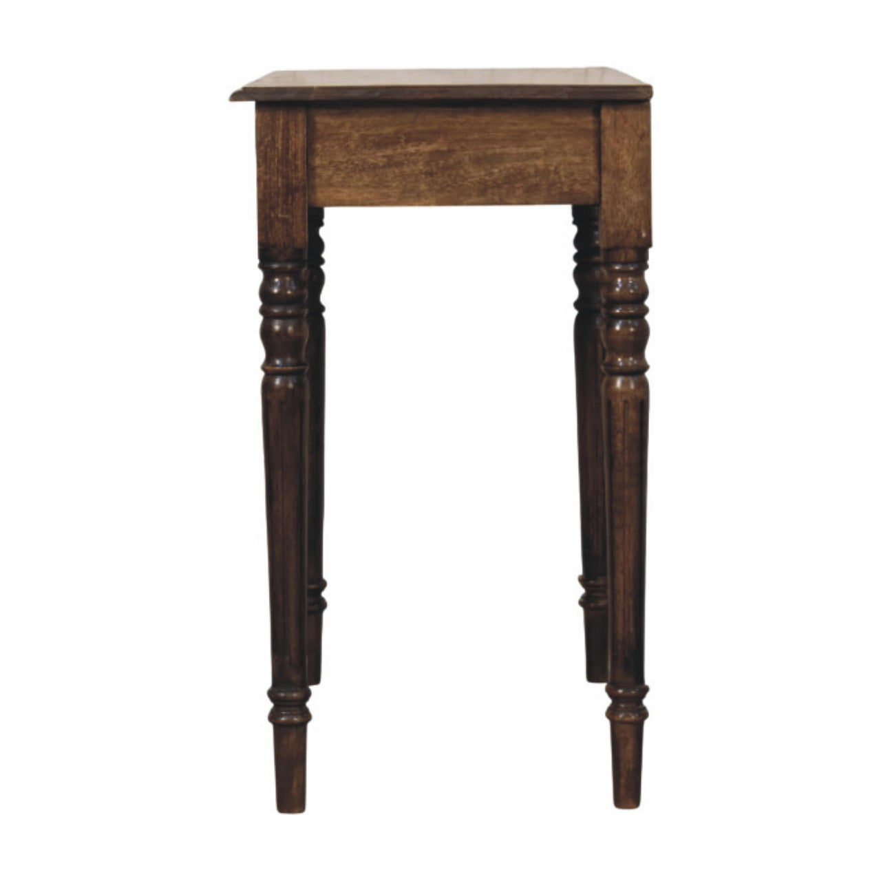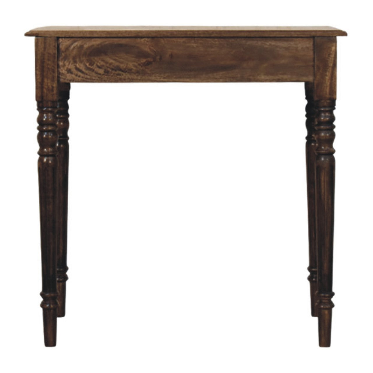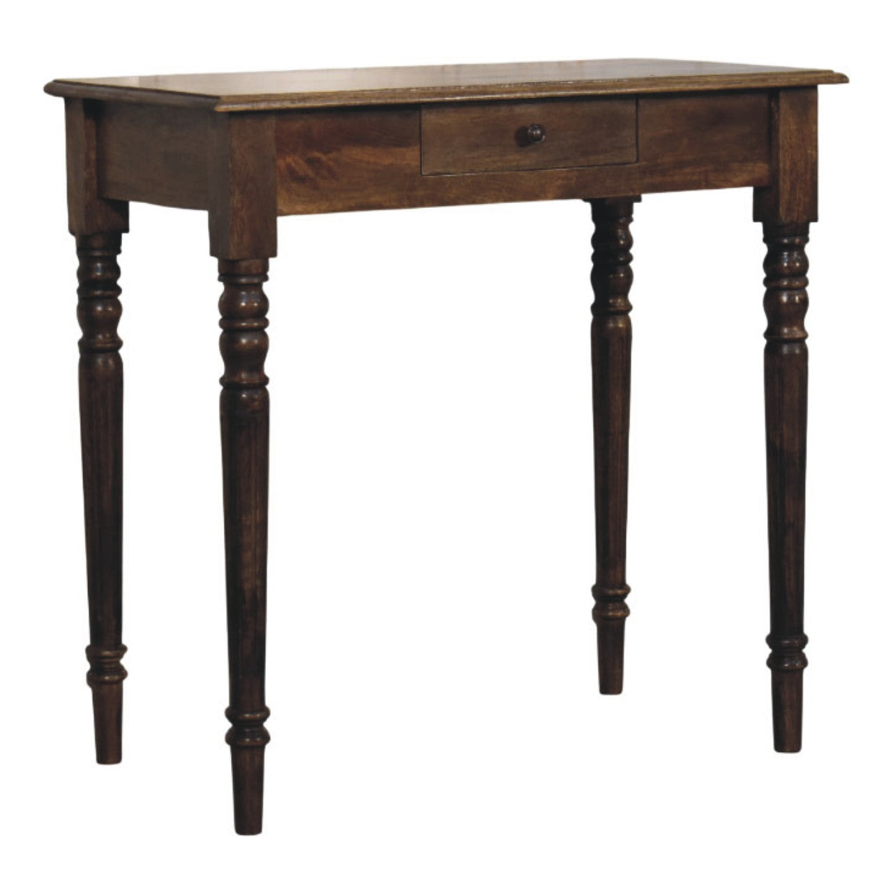 Crafted from 100% solid mango wood and finished in a classic grey tone, this writing desk brings a refined touch to your space. The gracefully turned legs lend a traditional character, while the compact drawer keeps your essentials close at hand. Whether placed in a hallway or study corner, this piece delivers timeless style with practical functionality. Height: 80 cm, Width: 80 cm, Depth: 45 cm Carton Height: 30 cm, Carton Width: 90 cm, Carton Depth: 55 cm