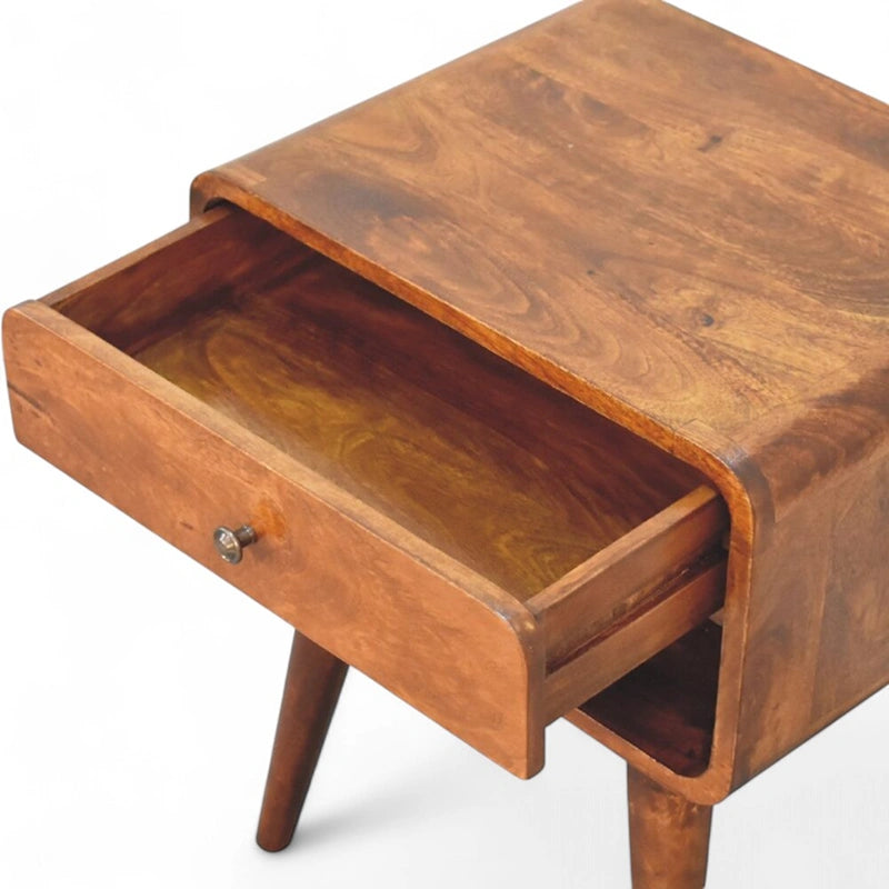Compact and elegant, this mid-century modern nightstand is crafted from solid chestnut wood and designed with a gently curved front. Its open shelf provides easy access for books or essentials, while the smooth top offers space for a lamp or décor.