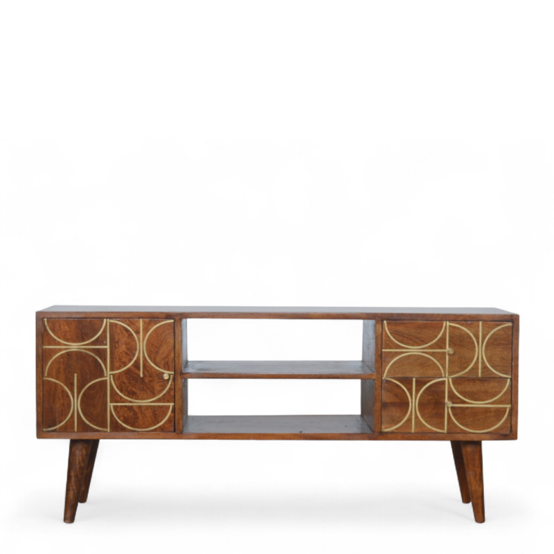A striking blend of artistry and function, this gold inlay TV stand transforms your living room into a showcase of modern design. Handcrafted from solid mango wood with a chestnut finish, the piece is elevated by intricate brass inlay detailing, forming an abstract geometric pattern across the doors. The warm tones of chestnut wood paired with golden highlights create a bold yet timeless aesthetic.