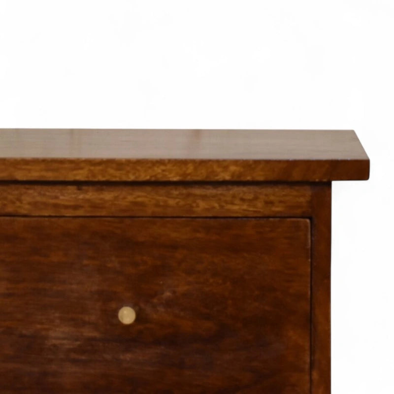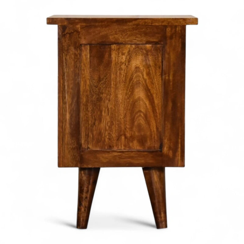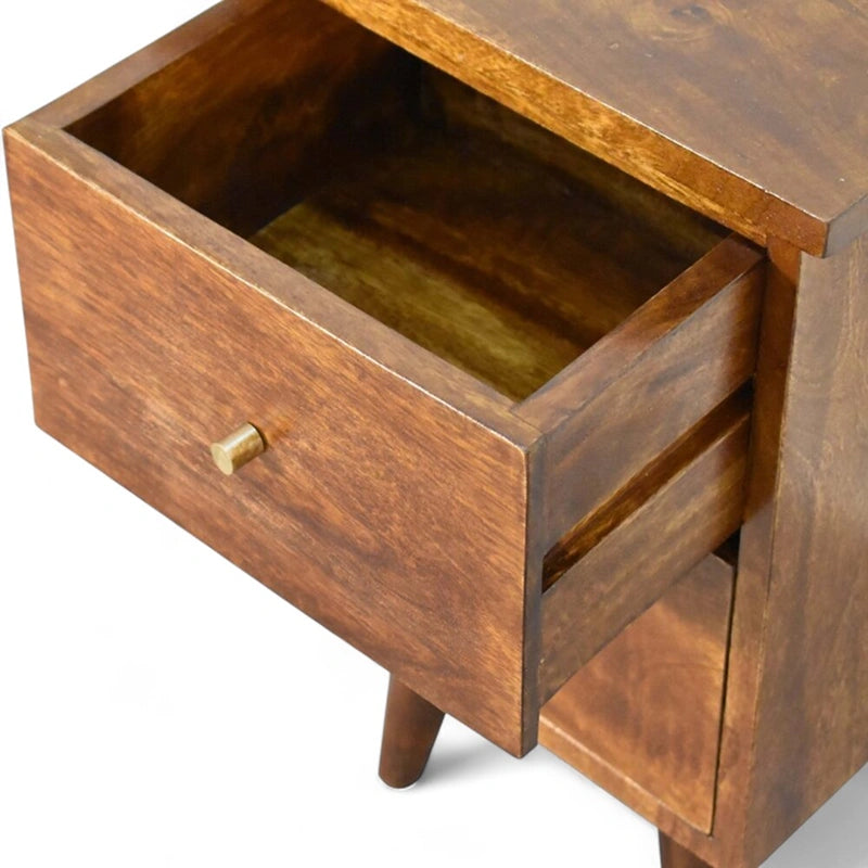 Crafted from rich chestnut wood, this mid-century modern nightstand blends timeless craftsmanship with everyday practicality. Its clean lines and natural finish showcase the wood’s unique grain, making it both a functional and stylish addition to your bedroom.