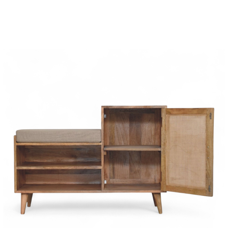 Featuring two spacious open slots, this storage bench is perfect for organizing shoes, baskets, or small essentials, while also serving as a comfortable seating option in your entryway, bedroom, or hallway. Hand-finished to highlight the natural grain of the oak-ish wood, every piece carries unique variations that celebrate artisan craftsmanship.