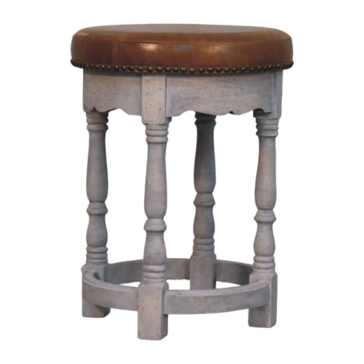 The Rustic Charm Stool combines artisanal craftsmanship with timeless character. Handcrafted from solid mango wood in an acid wash finish, its turned legs and scalloped apron bring a vintage-inspired elegance. The plush brown leather seat, adorned with antique brass stud detailing, adds comfort and sophistication. Perfect as an accent piece, vanity stool, or extra seating, this versatile design blends rustic warmth with refined style, making it a statement addition to both traditional and contemporary interiors.